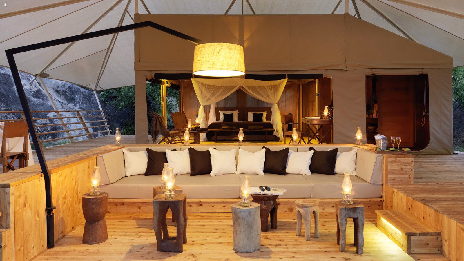 The extremely large tents are built on raised wooden platforms on the hillside (ensuring they all have a good view of the landscape). There is an inner, closed part to the tent comprising of the bedroom and bathroom and an extremely large covered outdoor veranda outside of the this, with a seating area and jacuzzi from which to enjoy the surrounding landscape in style.