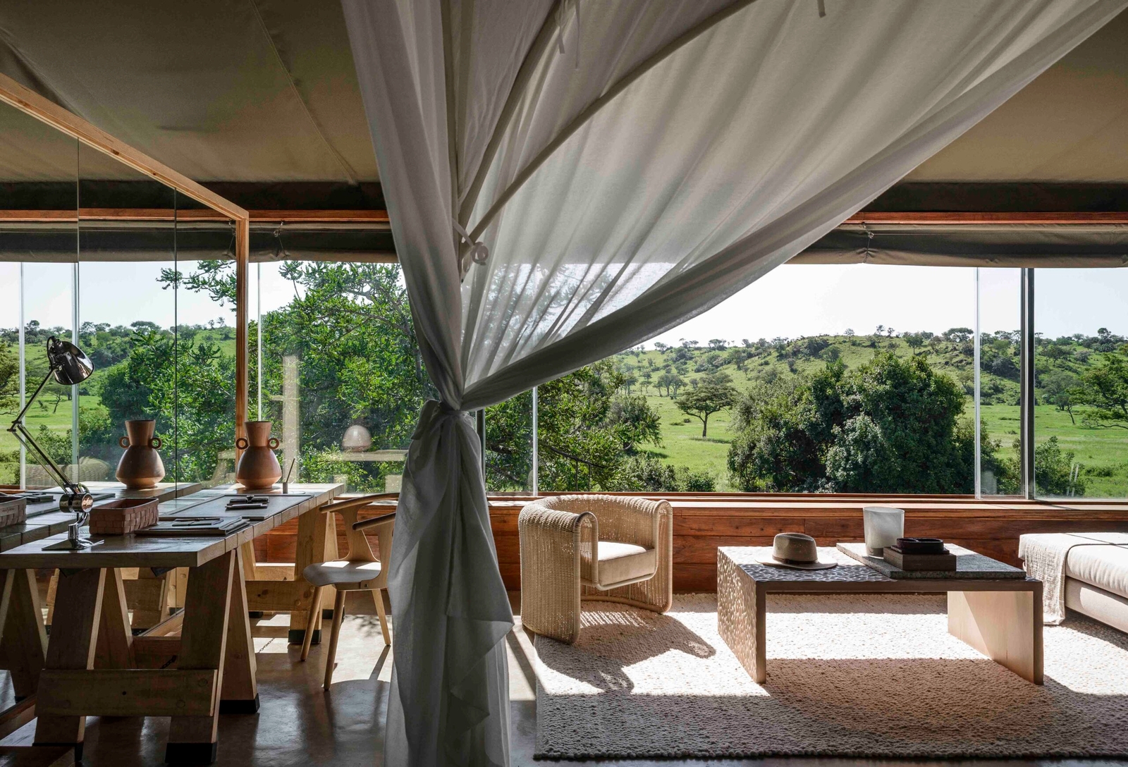 In centre is the main lodge, shaped to reflects the form of a flamingo with its wings spread, which includes a dining room, lounge, library, viewing tower, swimming pool, spa, sundeck and its own spectacular view over Lake Manyara.
