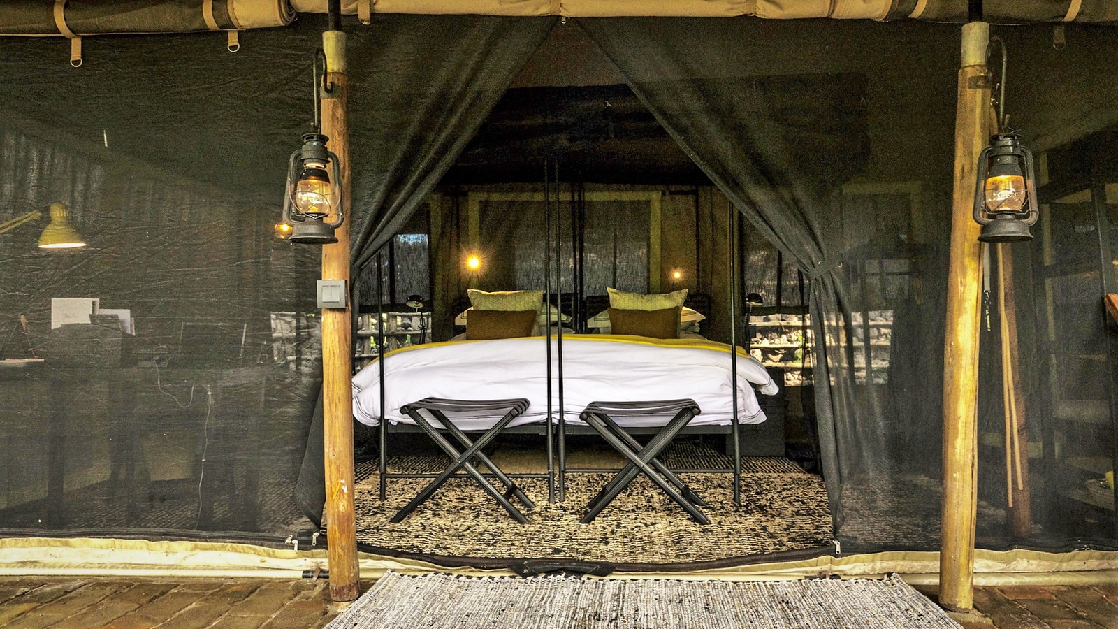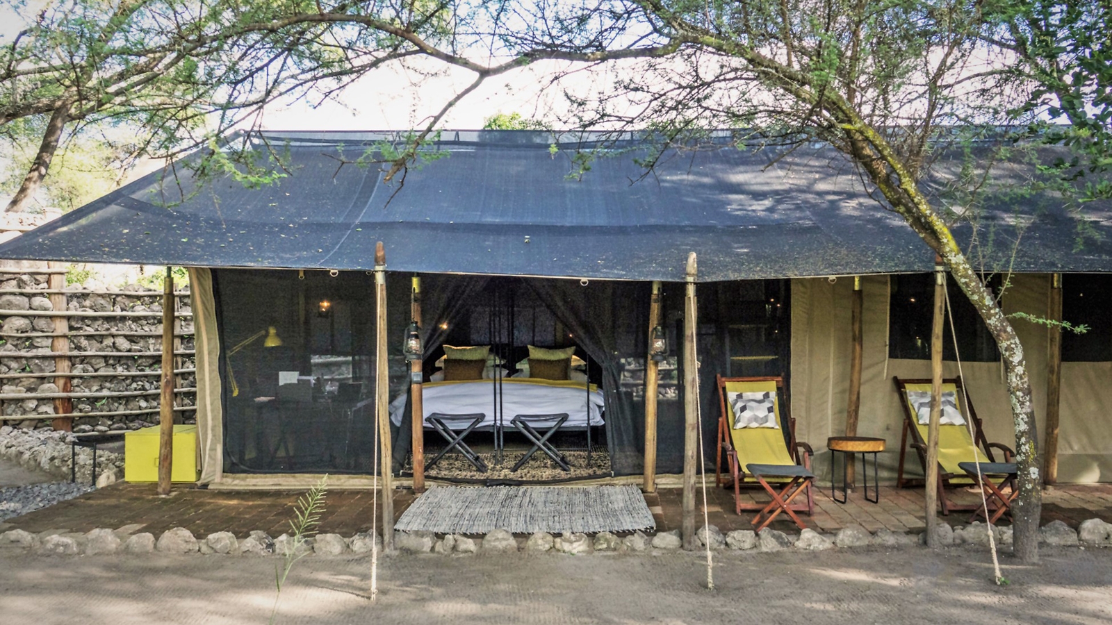 The camp consists of two vintage-style safari tents and one two-bedroom family tent, all with indoor and outdoor showers. Accommodating up to six adults and two children, it is perfect for families or small groups looking for an intimate safari experience. A soft yellow, grey and black colour scheme is carried throughout the camp, and there is an elegant lounge tent, a fire pit and outdoor swing bed.