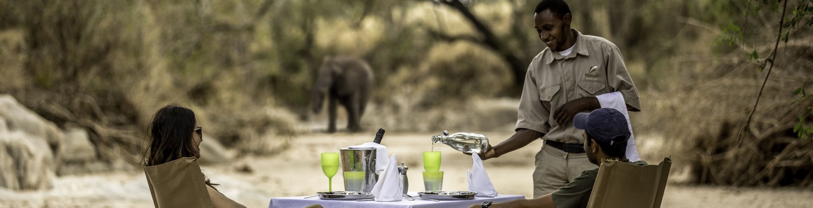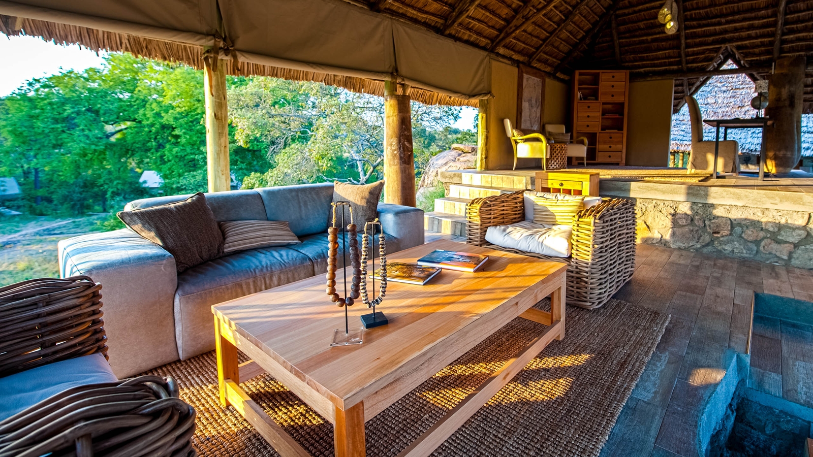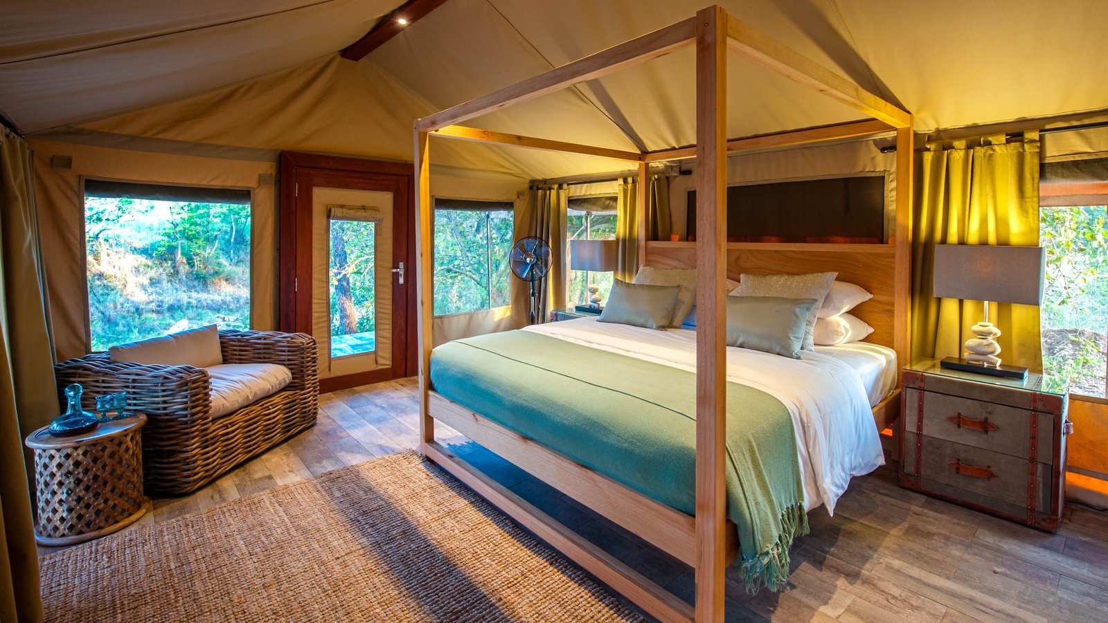 Just six stylish tents can be found along the edge of a riverbed between acacia trees. Each is large with a private game viewing deck and en suite bathrooms with fixed walls and rain showers.