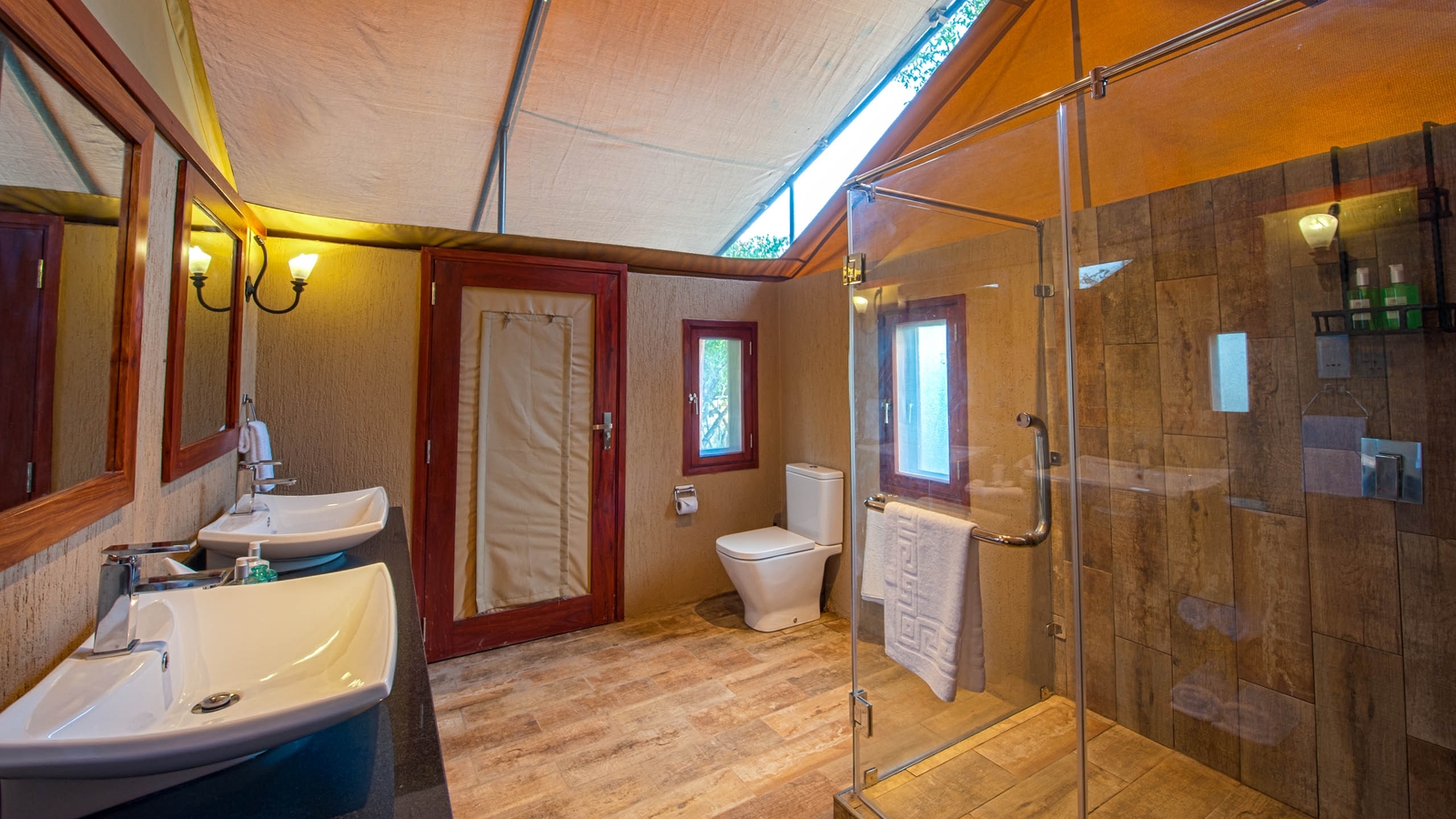 The main areas comprise of a spacious lounge, library and a central dining area that overlooks the swimming pool and a waterhole that attracts wildlife. You can also dine privately on the decking area outside your tent or out in the bush.
