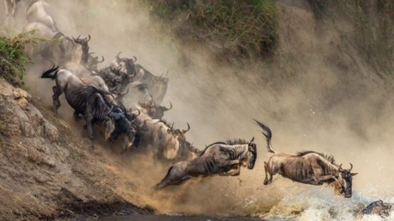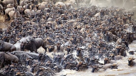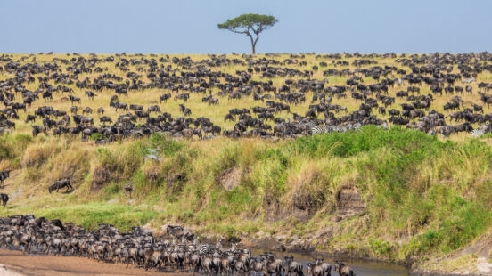 The Great Wildebeest Migration is the annual movement of millions of wildebeest, zebras, Thomson’s gazelles, Grant’s gazelles and other antelopes between Tanzania’s Serengeti National Park and the Maasai Mara in Kenya. On their journey the animals face predators including lions, cheetahs and crocodiles.