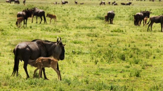 During the ‘greed season’ of January, February and March the migrating herds congregate in the Serengeti, where around 400,000 wildebeest are born each year. During peak birthing season in February several thousand calves are born each day. The short nutrient-rich grass keeps them safe from predators.