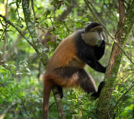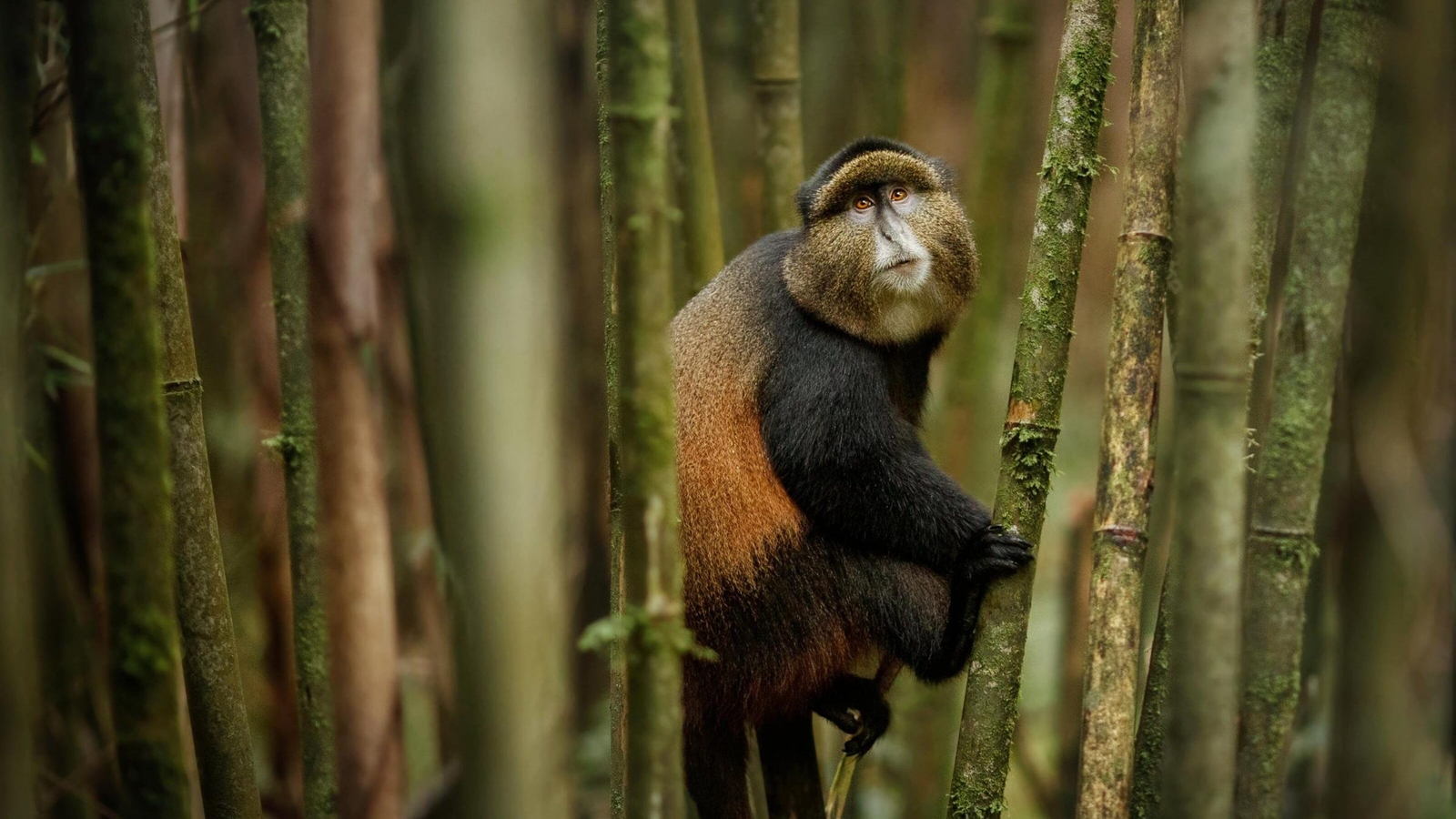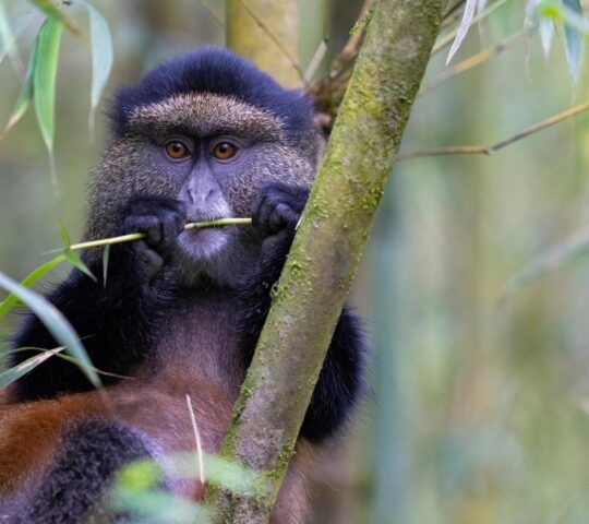 The endangered Golden monkey enjoys a territory of highland forests, especially bamboo, living in groups of up to thirty individuals. A handful of troops in Volcanoes National Park have been habituated and can be tracked in a similar way to the gorillas. The monkeys are playful and inquisitive and often spend their time leaping from bamboo branches or frolicking on the forest floor towards the base of the volcanoes and have overcome their initial shyness to accept their daily visit by researchers and tourists.