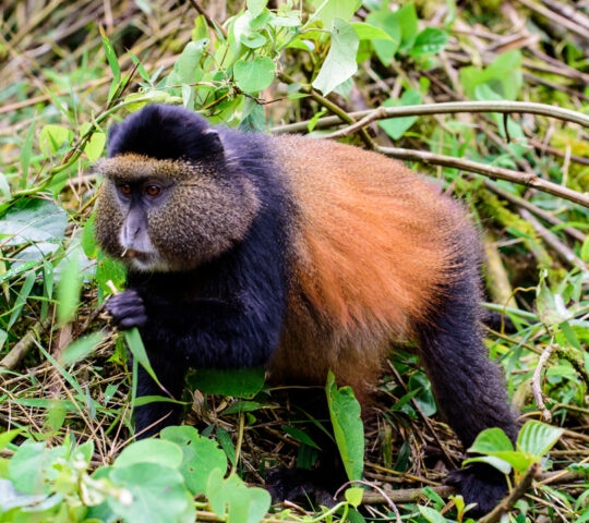 The endangered golden monkey enjoys a territory of highland forests, especially bamboo, living in groups of up to thirty individuals. A handful of troops in Volcanoes National Park have been habituated and can be tracked in a similar way to the gorillas. The monkeys are playful and inquisitive and often spend their time leaping from bamboo branches or frolicking on the forest floor towards the base of the volcanoes and have overcome their initial shyness to accept their daily visit by researchers and tourists.