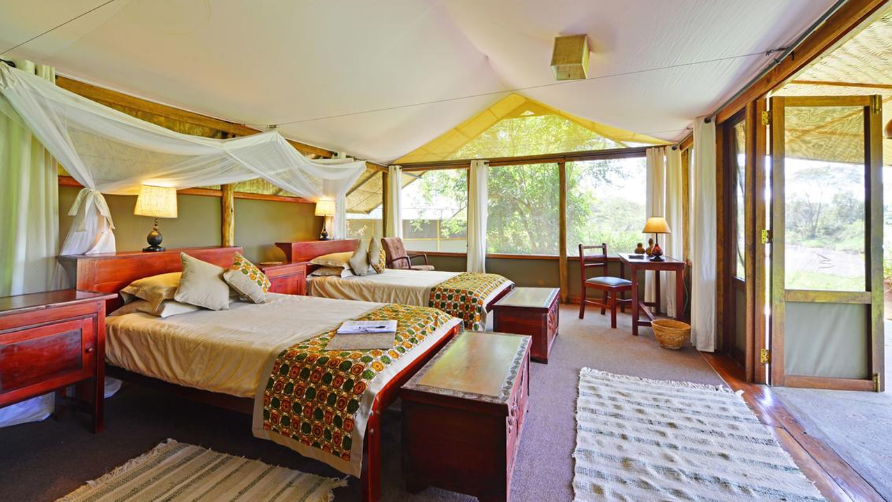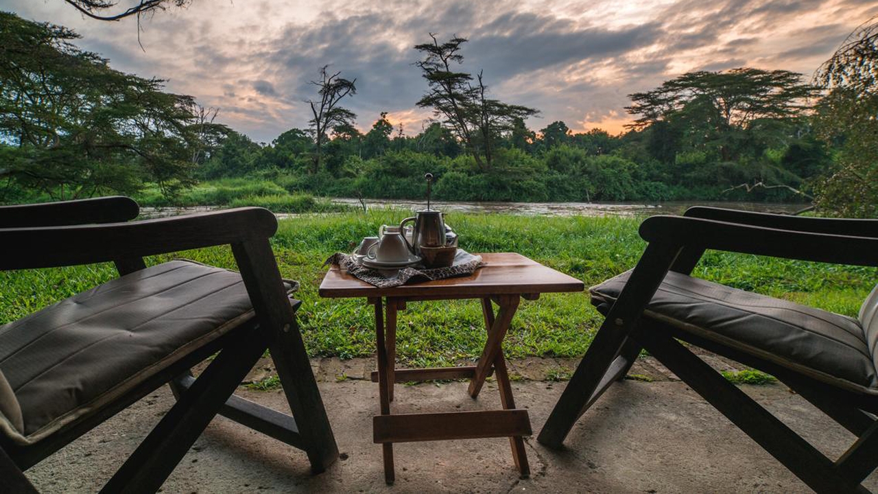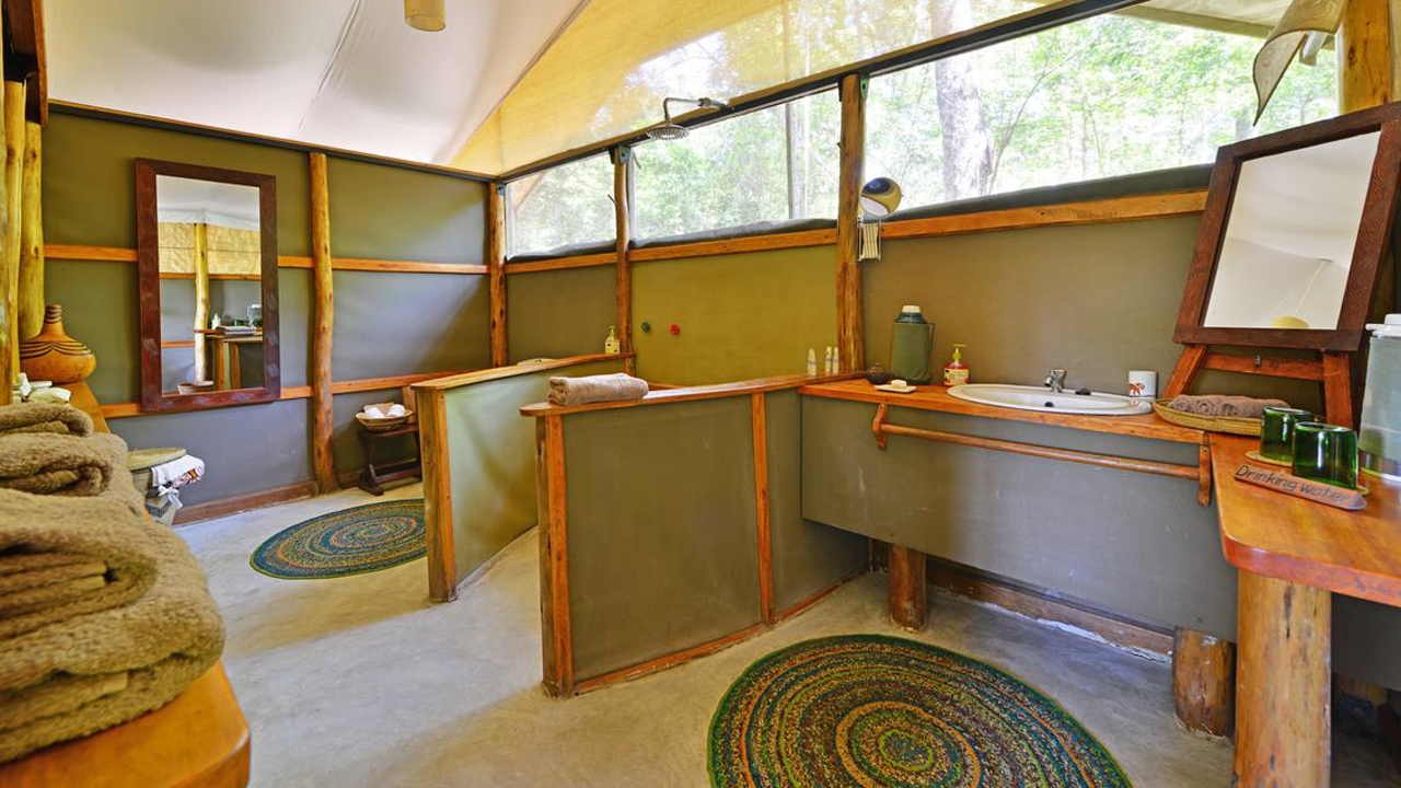 Each of the ten spacious framed canvas rooms, situated in the wooded area besides the river, is comfortably furnished. Decorated with large mosquito netted beds, they all come with their own private en-suite bathroom and dressing area, providing running water, hot water ‘bush’ showers and a flushing eco-friendly toilet. There’s no better way to end a day here than under the trees next to the river, where you can enjoy freshly prepared meals which utilise many local ingredients, as well as relax around the evening ‘fireplace’ for sundowners and a chance to share the day’s experience.