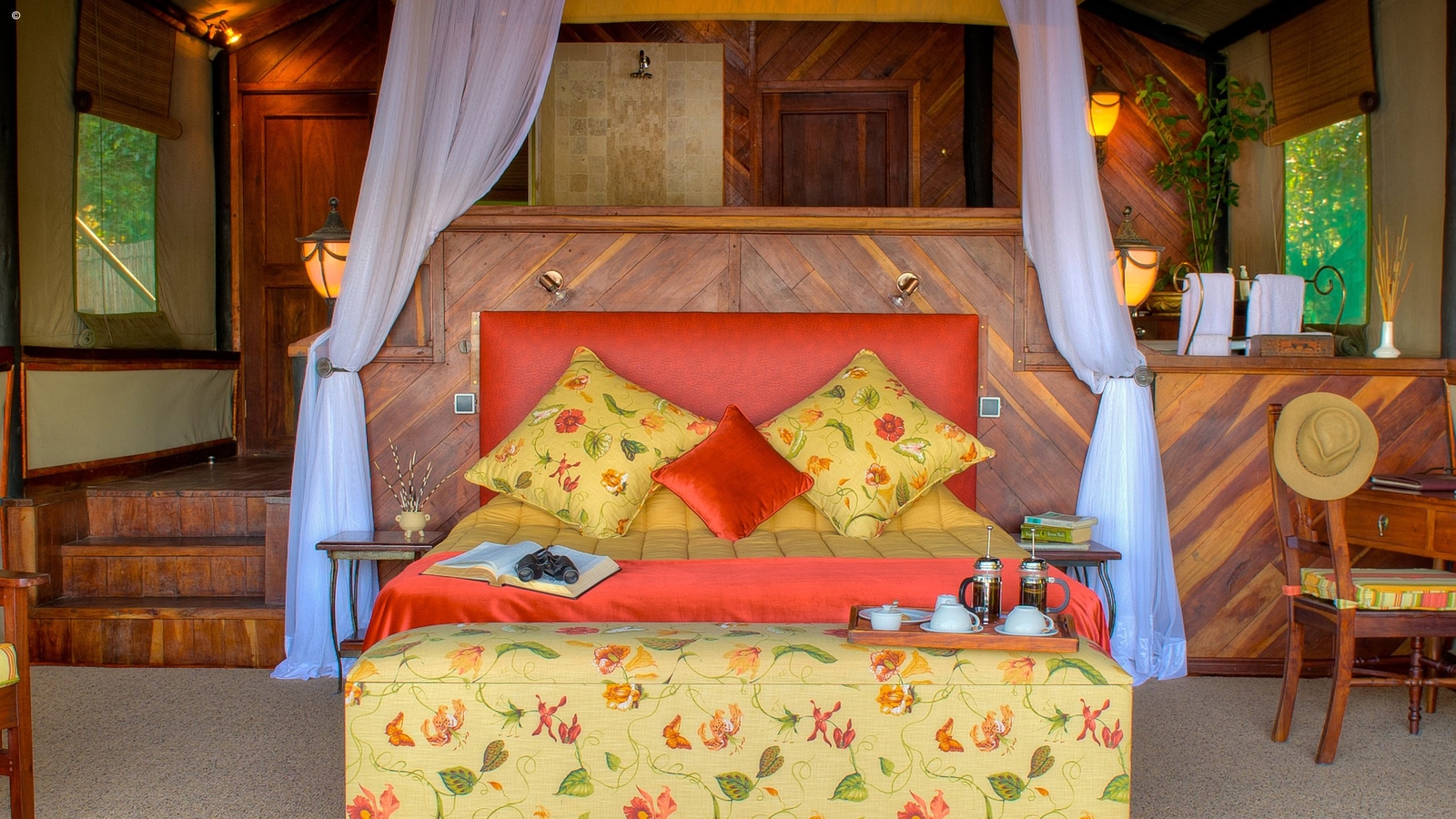 The lodge only has six luxury chalets and one stunning honeymoon suite, each with unique views of the flowing hippo-filled waters that eventually cascade over the enormous waterfall just down river. All of these colourfully decorated rooms are standalone and pleasingly private, with luxurious furnishings and private viewing decks where you can enjoy unrivalled views over the stretch of water before you. The honeymoon suite is often the highlight of our honeymoon trips, where the romance of your union is optimised in this beautiful Zambian setting.