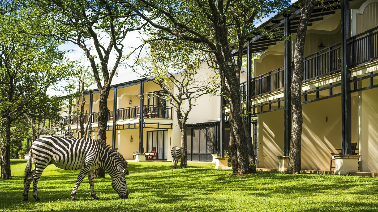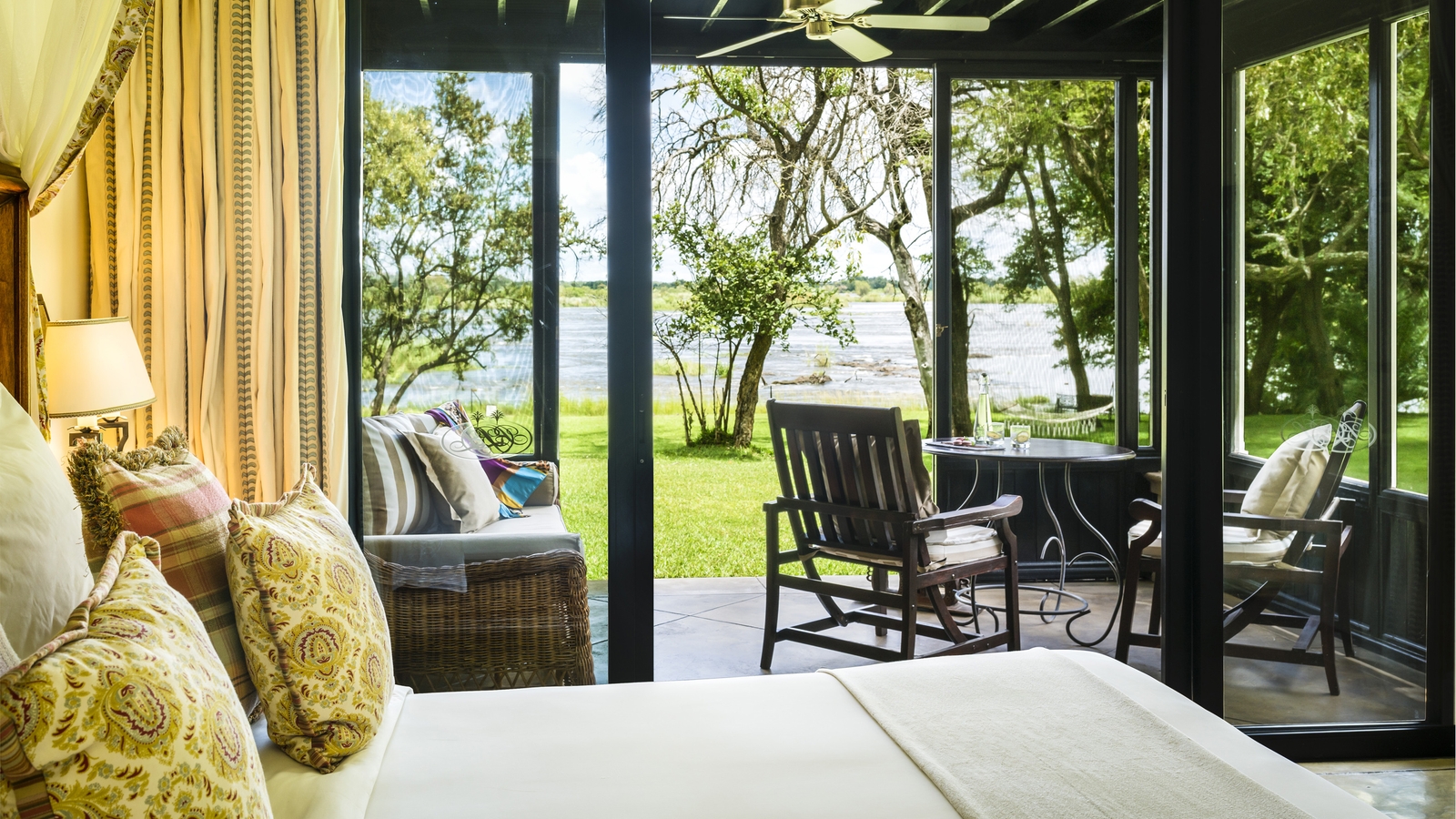 Set just a short walk away from the falls themselves on the banks of the Zambezi, one can admire the coil of steam and spray rising from the falls on the horizon.