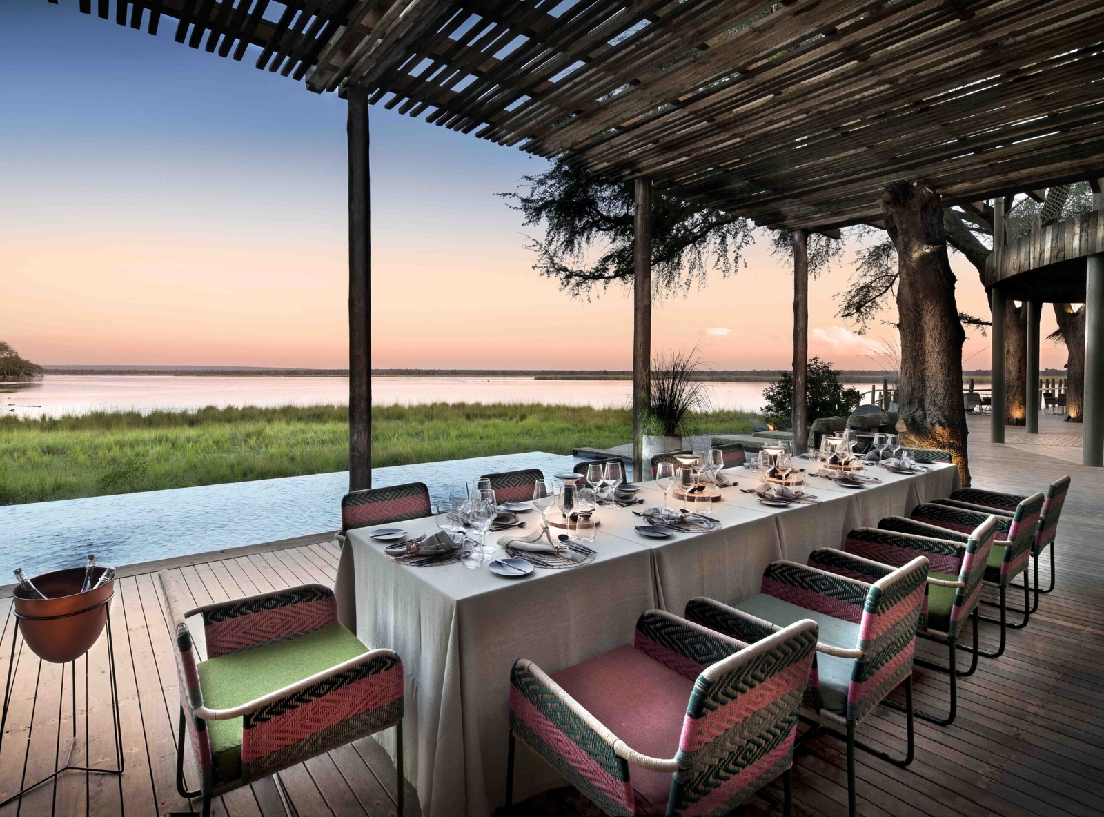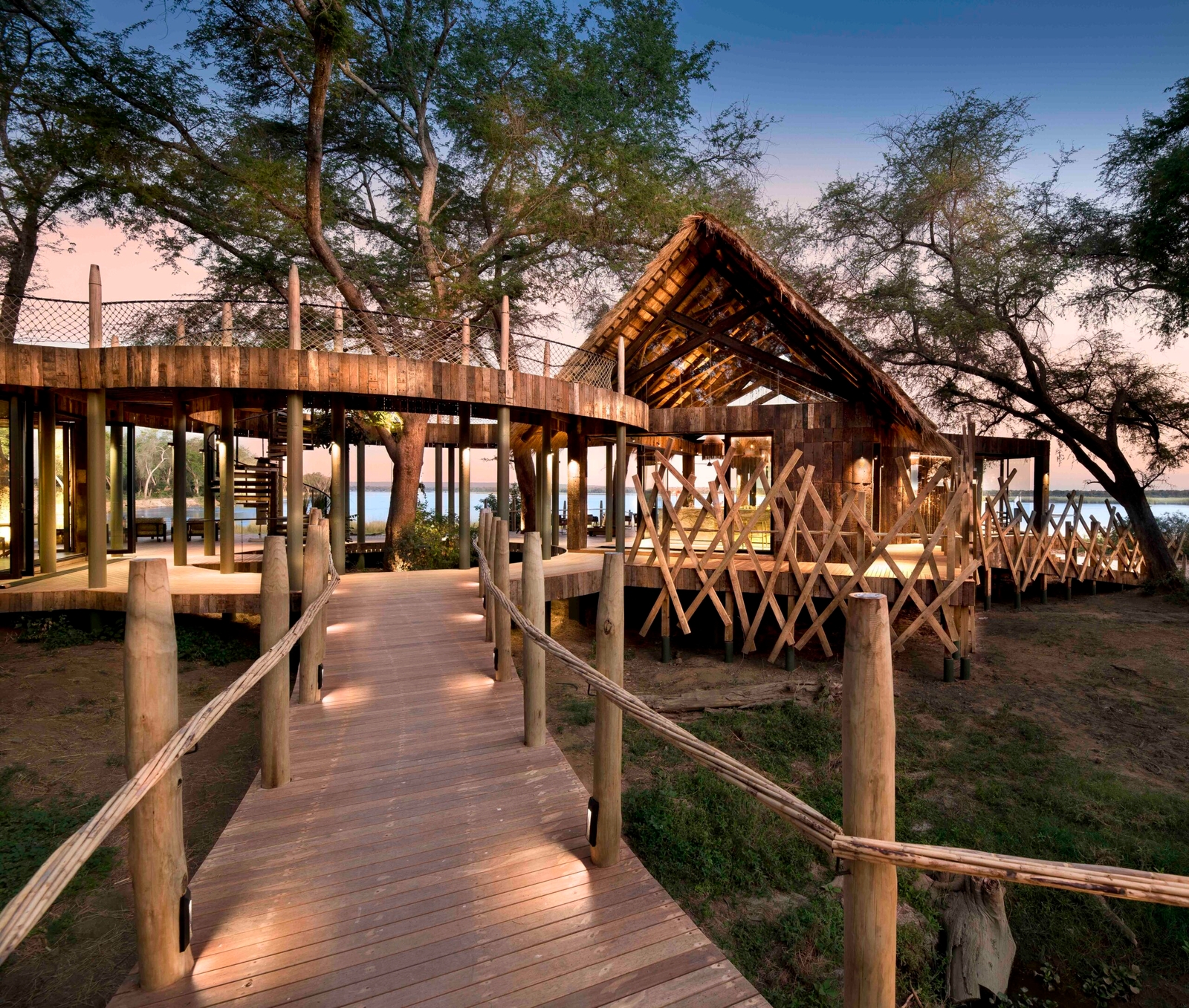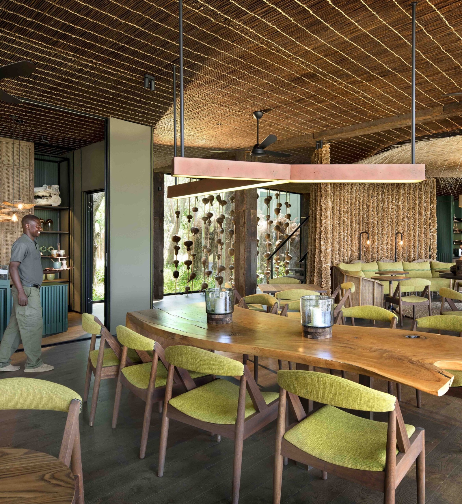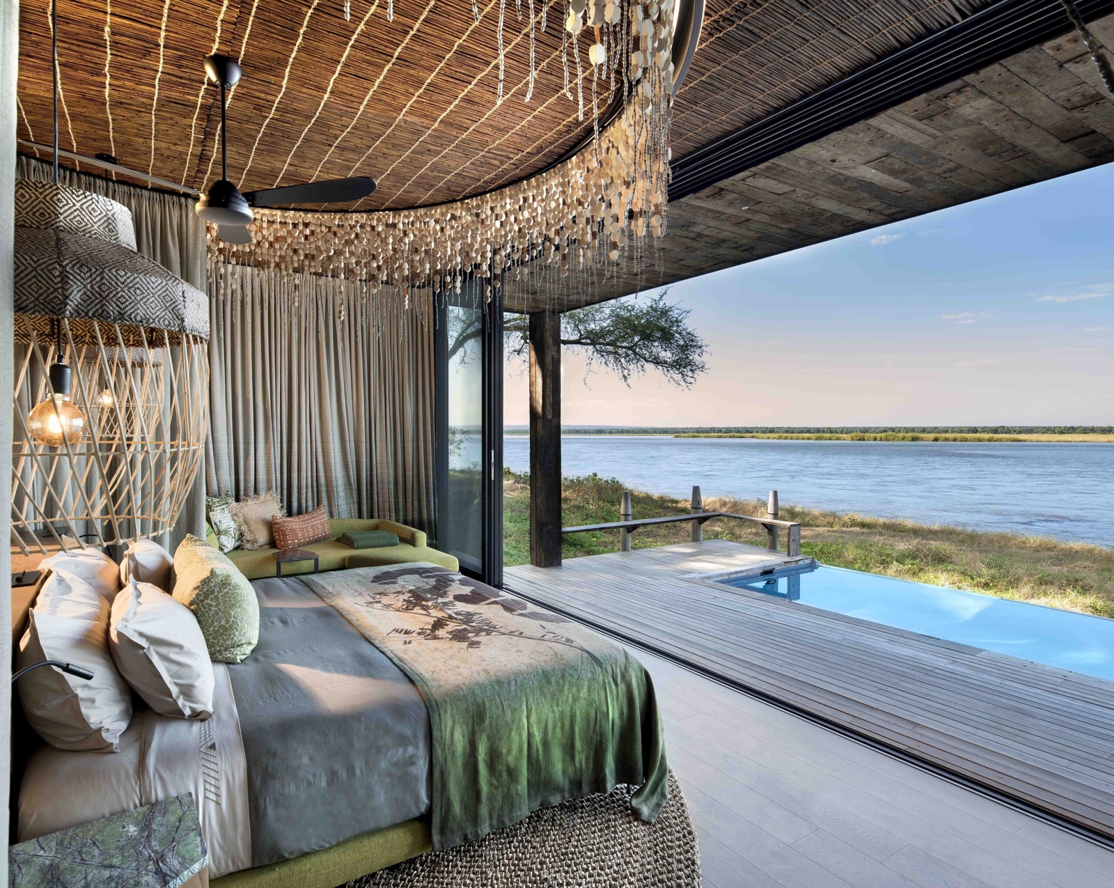 Lolebezi’s design embraces both contemporary elegance and African heritage, set amidst the majestic Acacia trees. Dotted throughout the lodge are artworks which honour the local culture and craftsmanship. Natural materials, like green rainforest marble, are skillfully incorporated throughout, enhancing the lodge’s integration with its surroundings. Each private suite here is a haven of luxury, with spacious bathtubs and serene plunge pools overlooking the Zambezi River. The suites boast marble vanities and both indoor and outdoor showers.