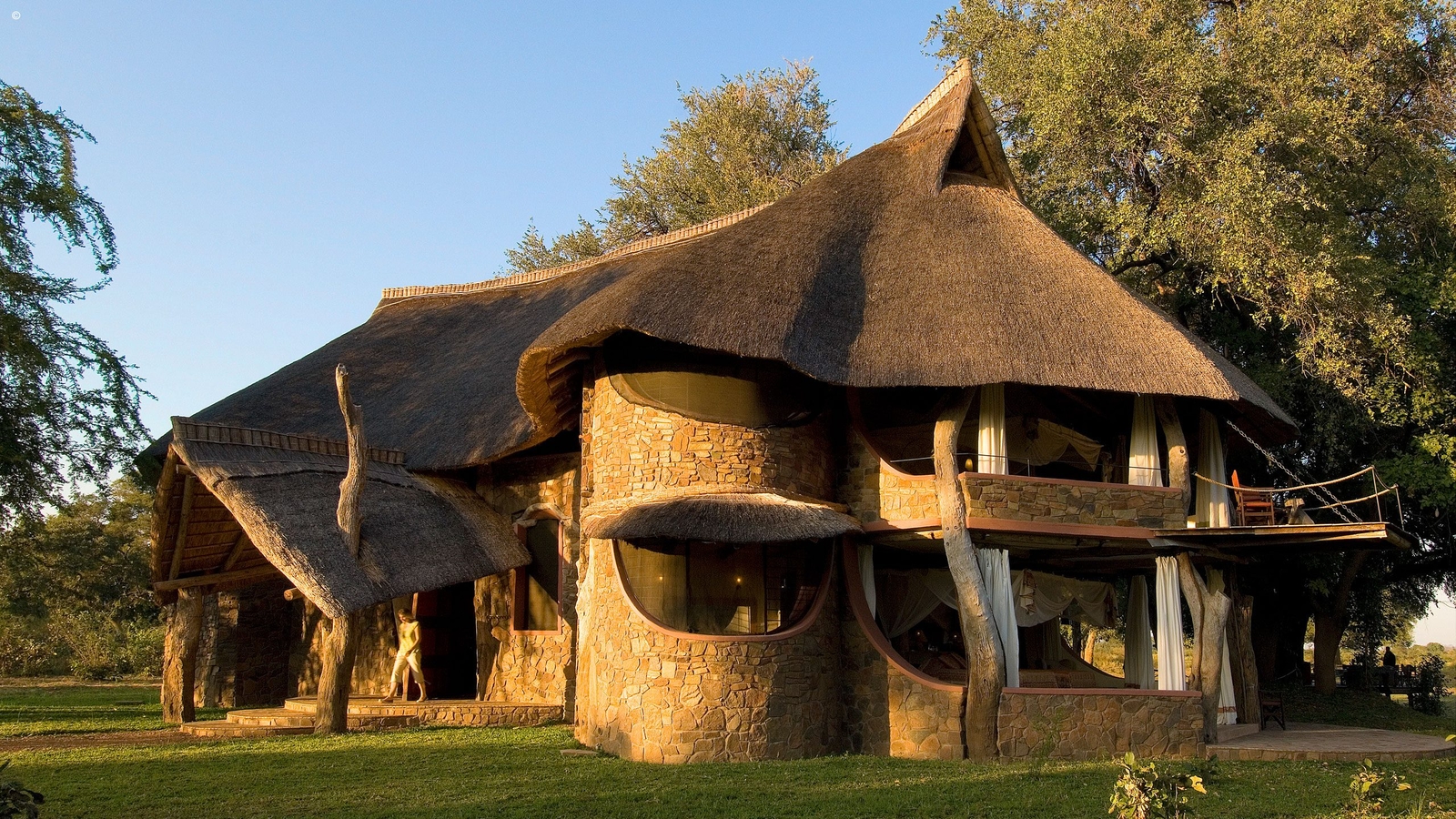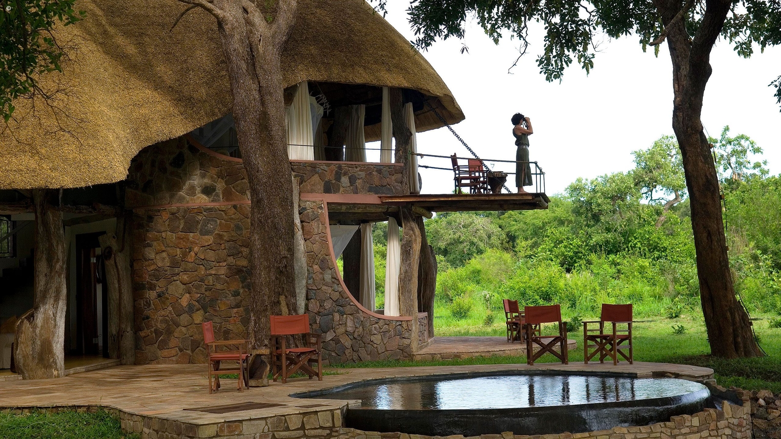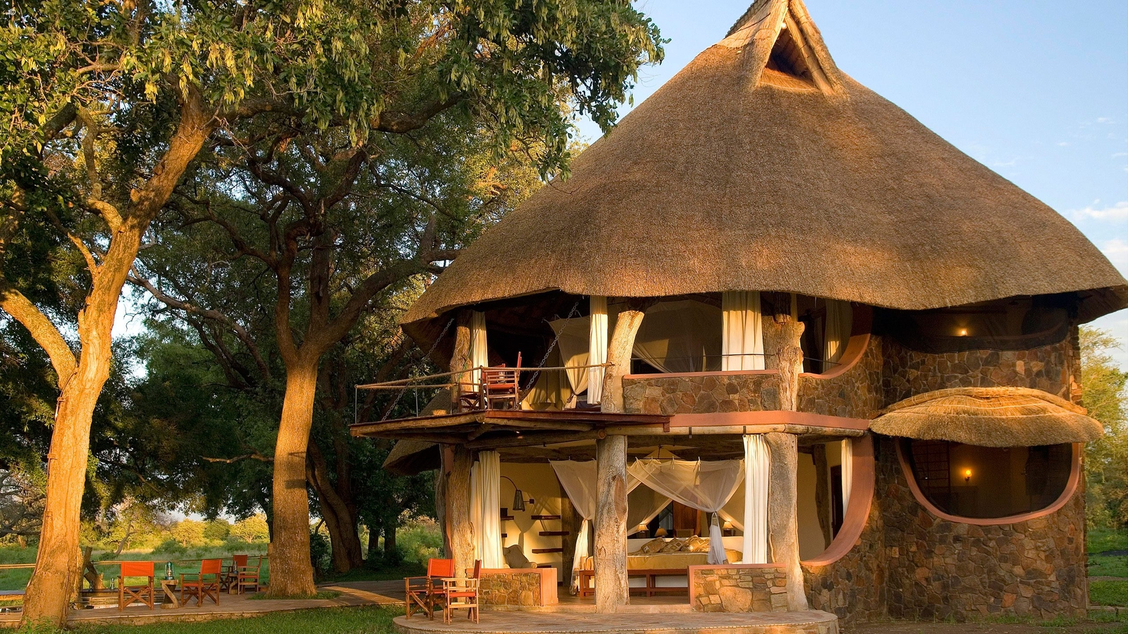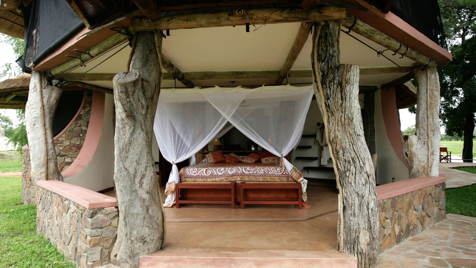 Designed by Neil Rocher, this stunning private house is situated on Robin Pope’s Nkwali land, approximately one kilometre from the Main Camp. The super structure of the house is twenty five ancient and weathered leadwood trees – powerful and natural. The entrance side of the house is grand and exquisitely built with stones from the hills. The massive pivot door opens onto the huge main room and instantly you see incredible views through the front of the house – which is completely open.