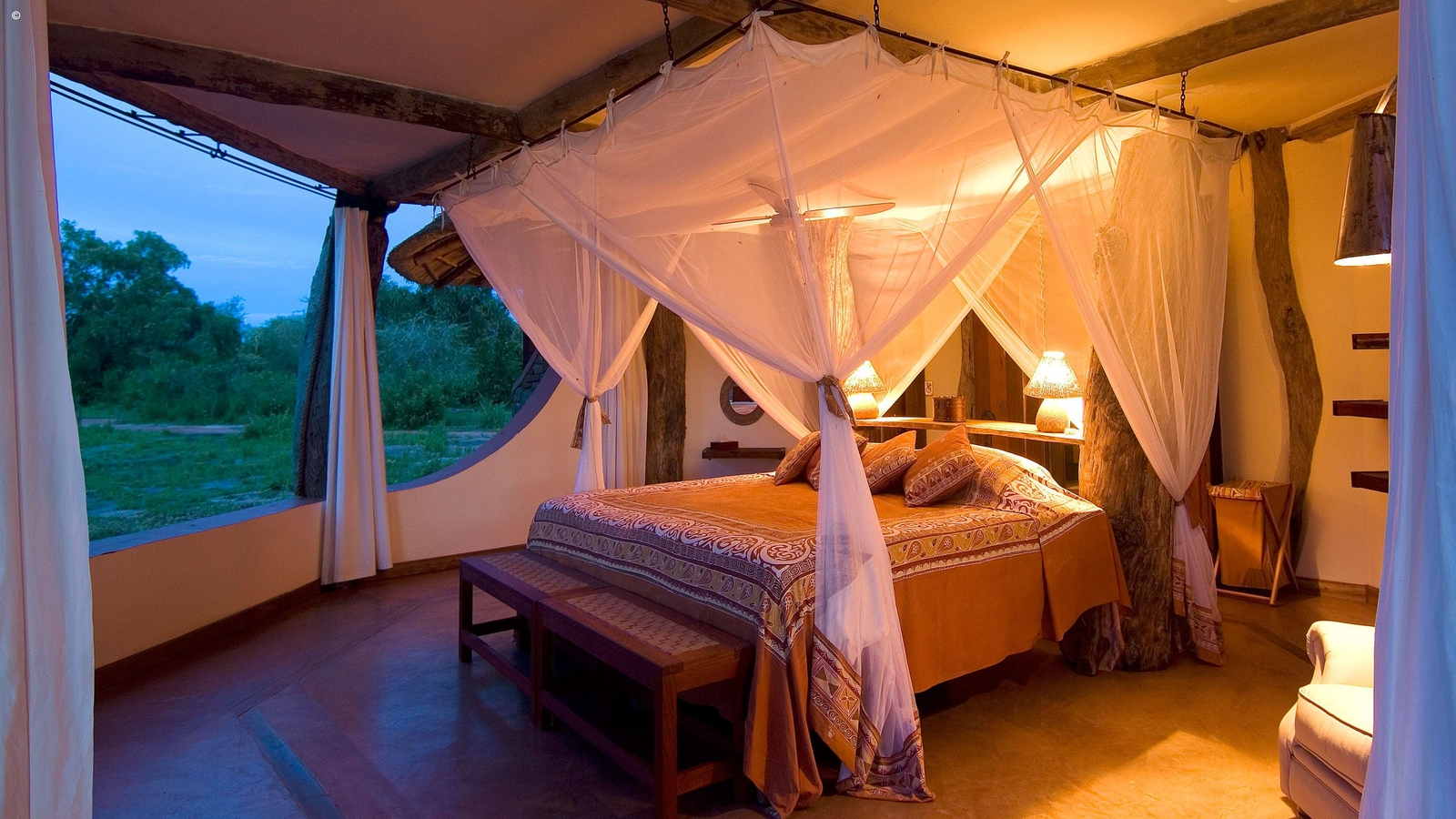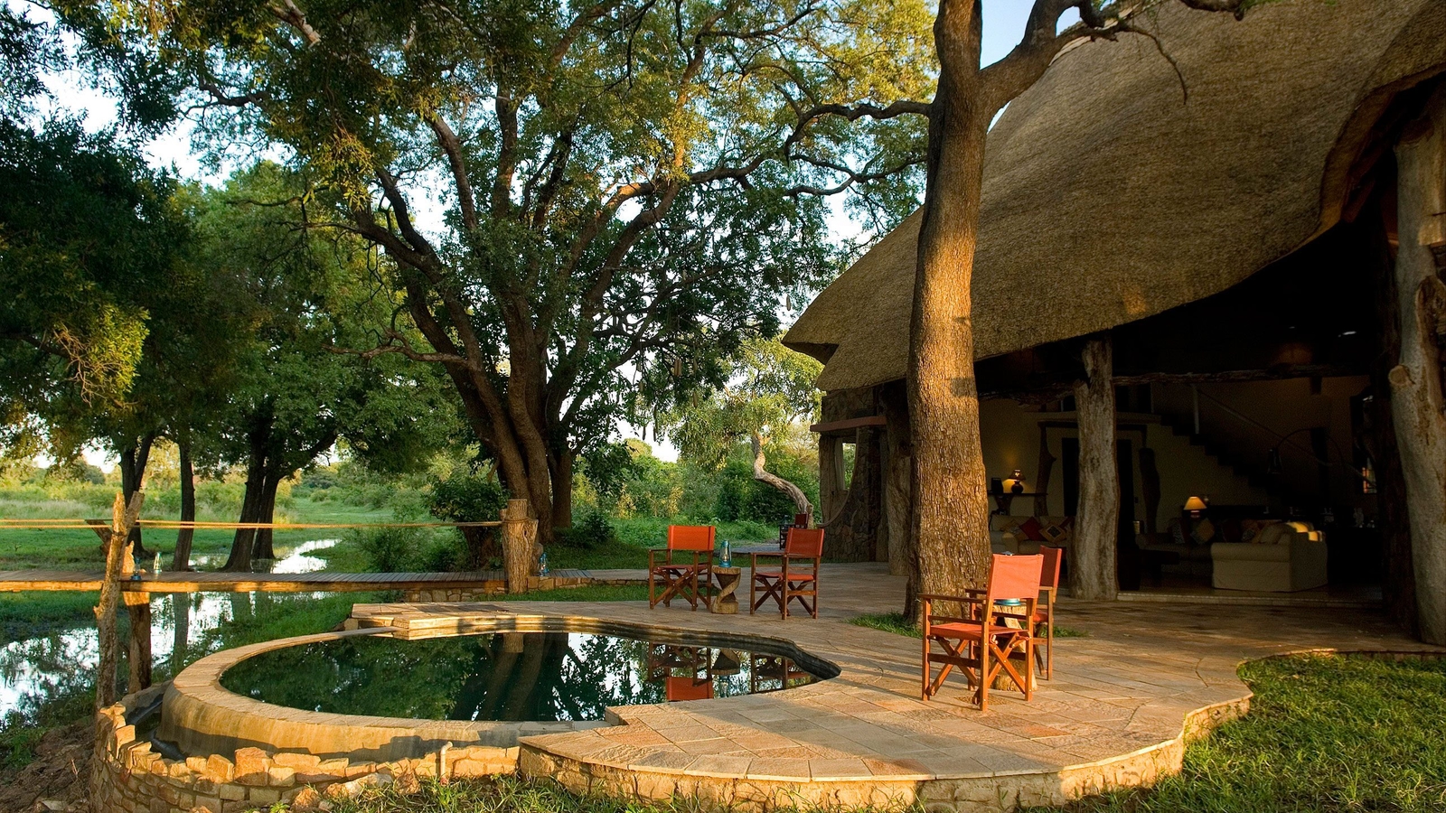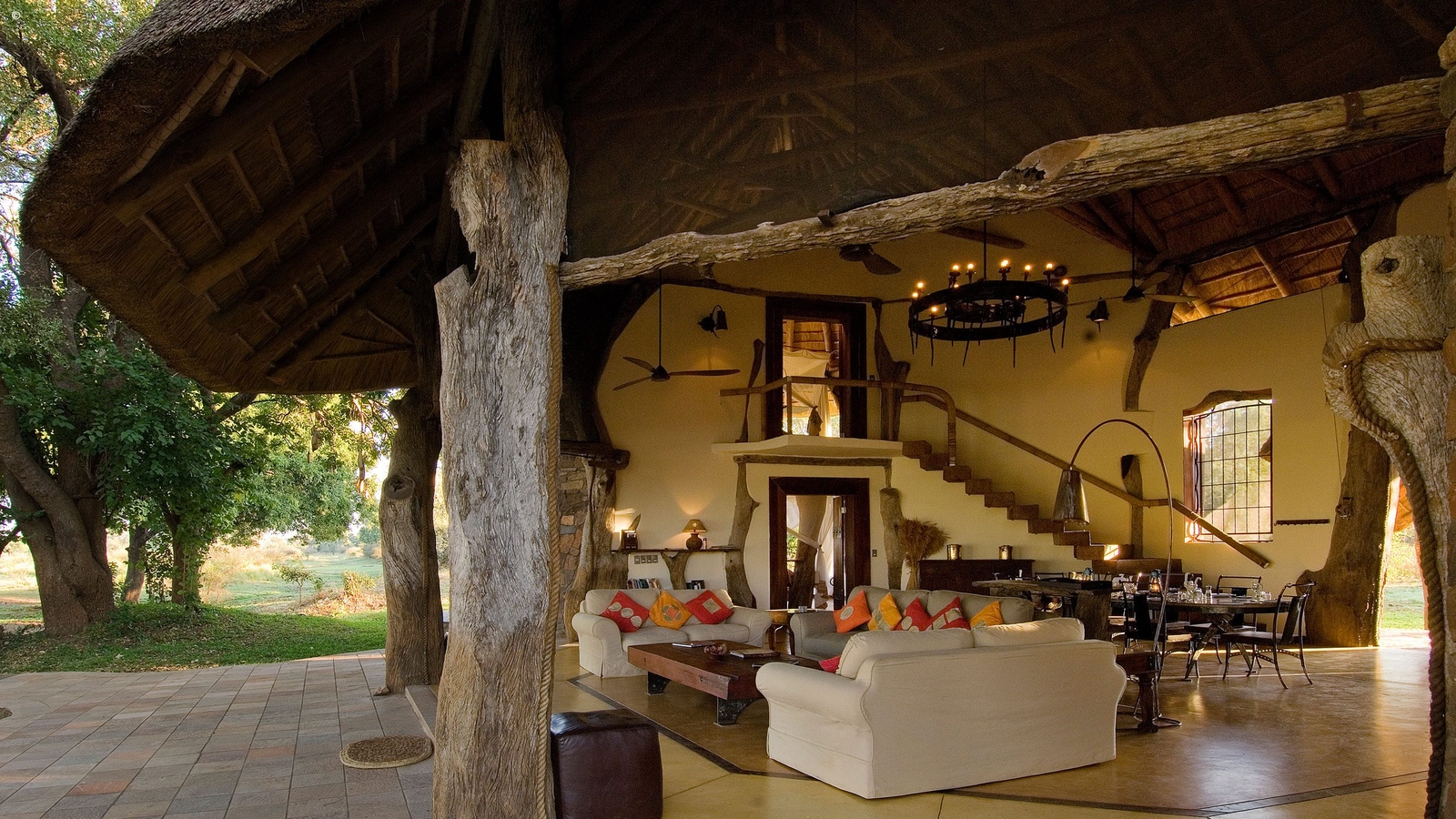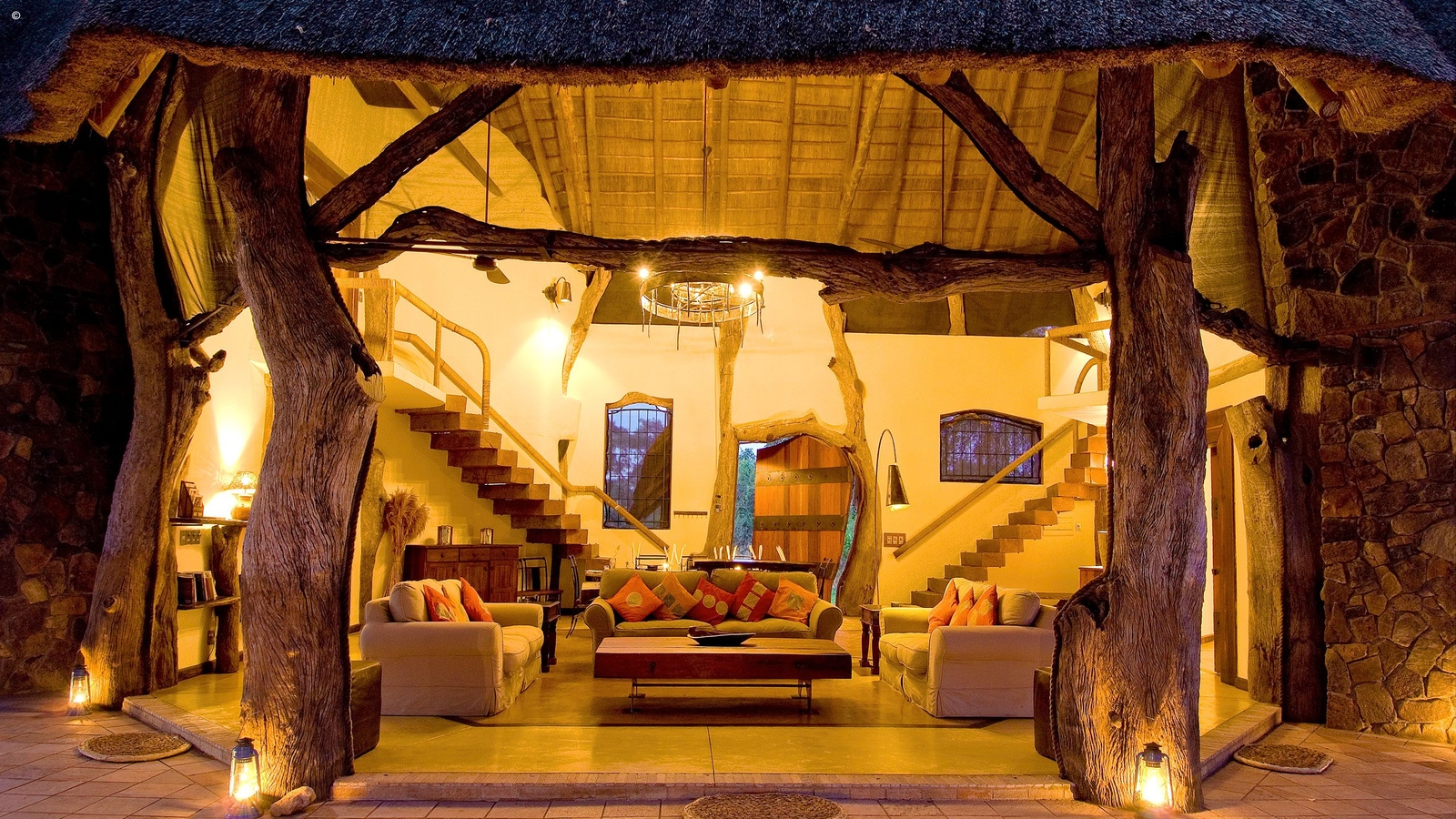 Designed by Neil Rocher, this stunning private house is situated on Robin Pope’s Nkwali land, approximately one kilometre from the Main Camp. The super structure of the house is twenty five ancient and weathered leadwood trees – powerful and natural. The entrance side of the house is grand and exquisitely built with stones from the hills. The massive pivot door opens onto the huge main room and instantly you see incredible views through the front of the house – which is completely open.