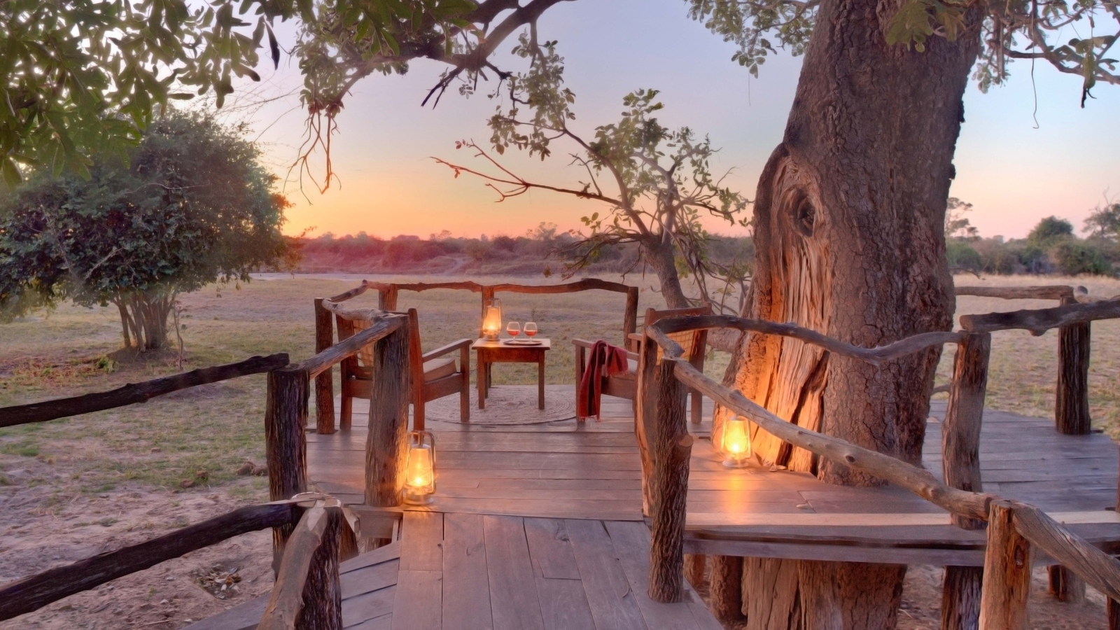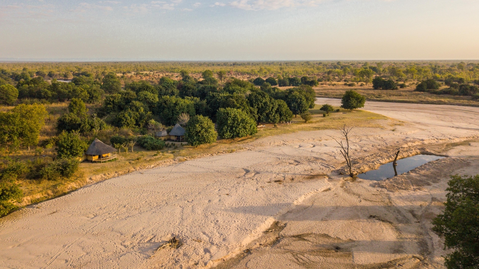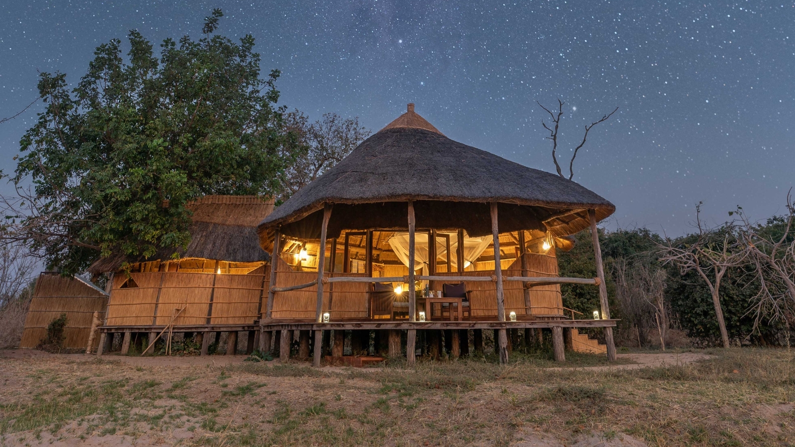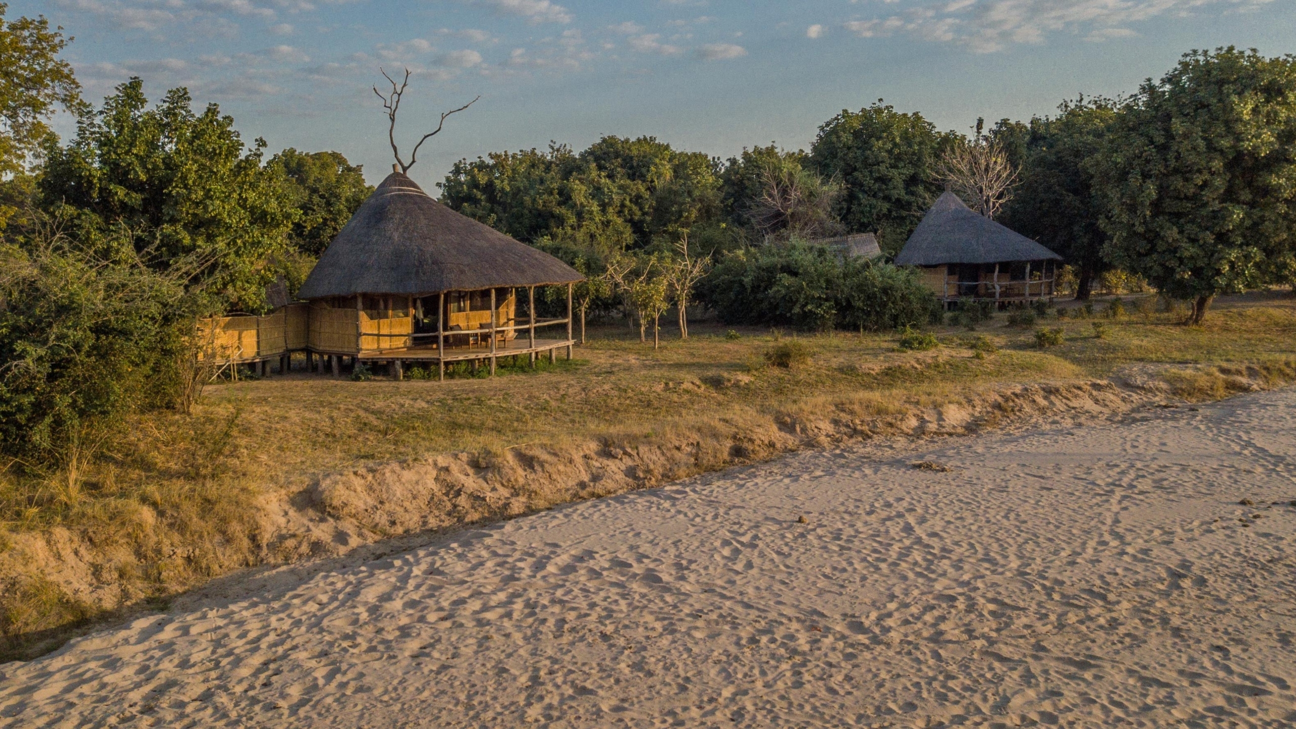 Four spacious chalets sit on raised wooden decks with grass and reed walls and large, open air en-suite bathrooms. Each chalet runs on solar power and is set under the shade of evergreen trees with private verandahs overlooking the surrounding bush and waterholes in the Luwi River.