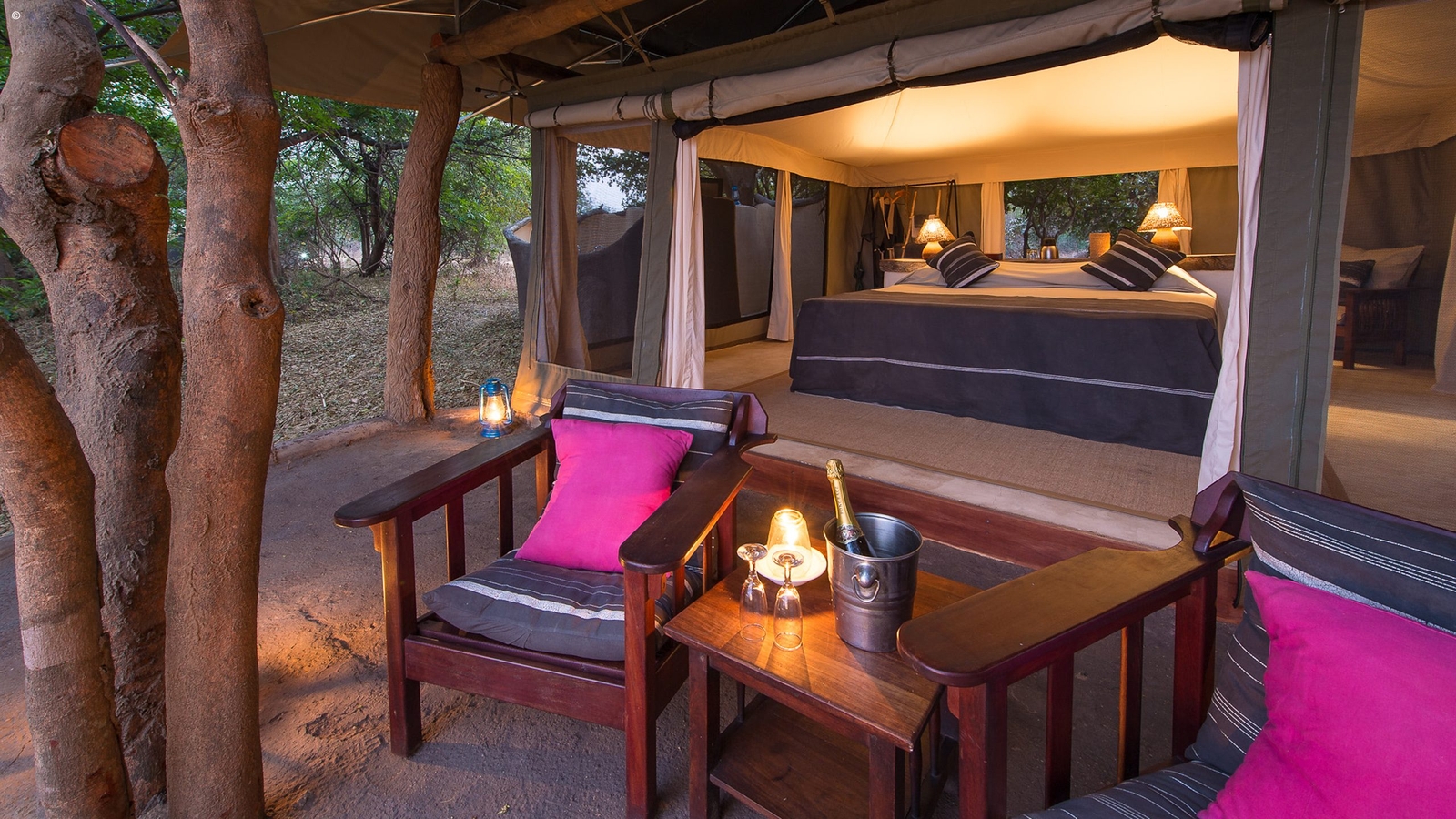 In the remote north of South Luangwa, on the edge of the Luangwa River, Tena Tena is surrounded by unspoilt wilderness, under a thick grove of mahogany trees.