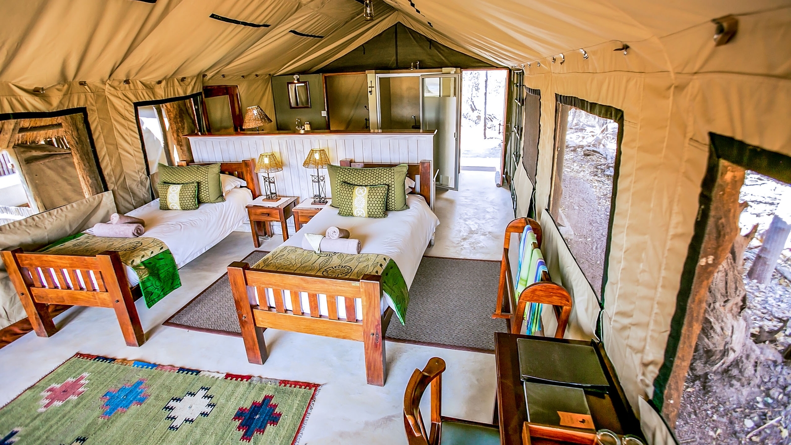 The hub of the camp is the ‘A-frame’ which houses the dining room, a downstairs sun lounge and a large comfortable lounge area upstairs. There’s also a plunge pool near the main lounge and dining room, and a tunnel leading to a wine cellar and hide.