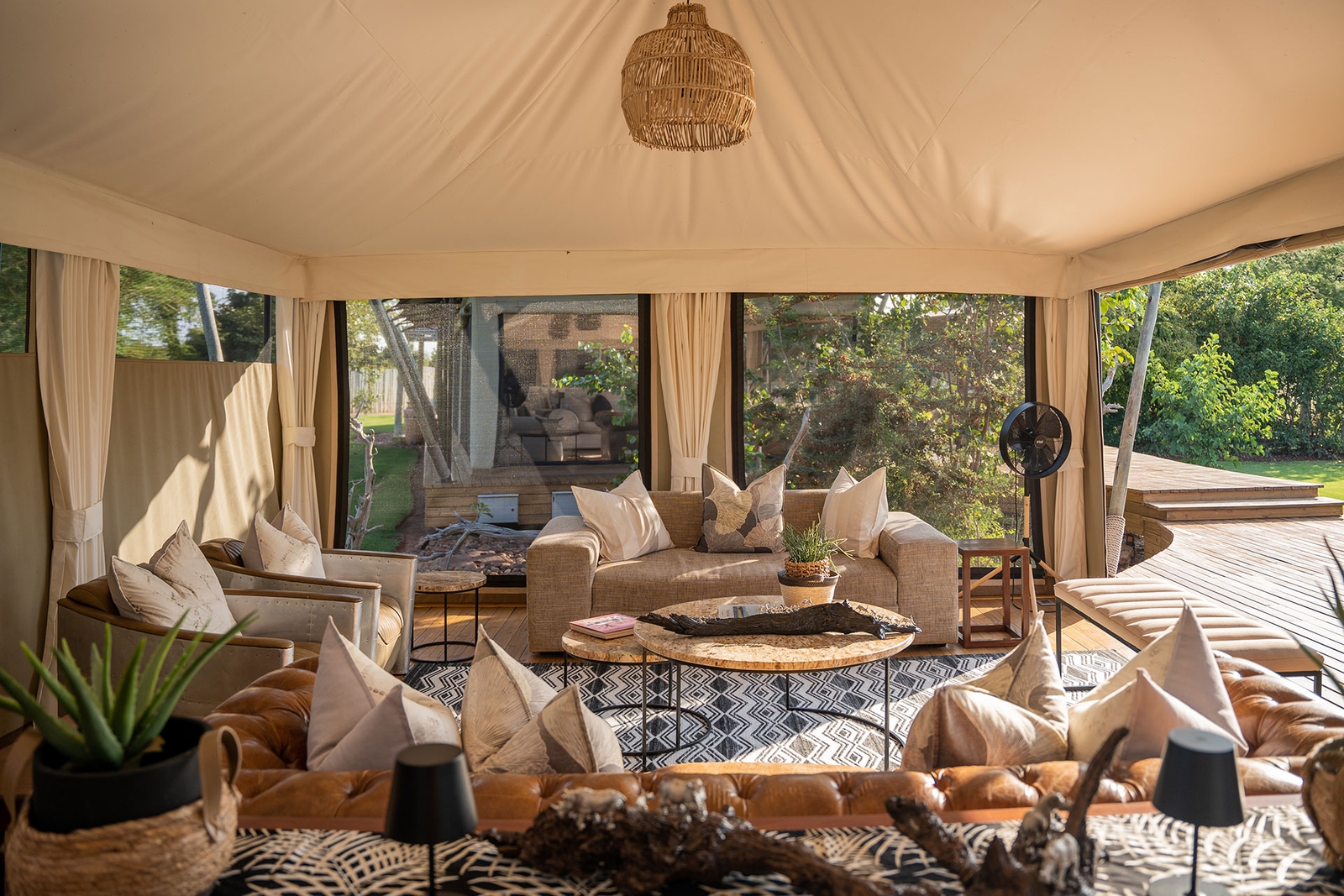 At the heart of each camp is a communal area with a variety of dining spaces, an interactive kitchen, convivial bar area and an al fresco area that encircles a blazing fire bowl. All with a unifying theme of a wood and copper, the ‘red gold’ of the country’s historical mining industry. There’s also a large central pool, massage sala, fitness centre and wine cellar.