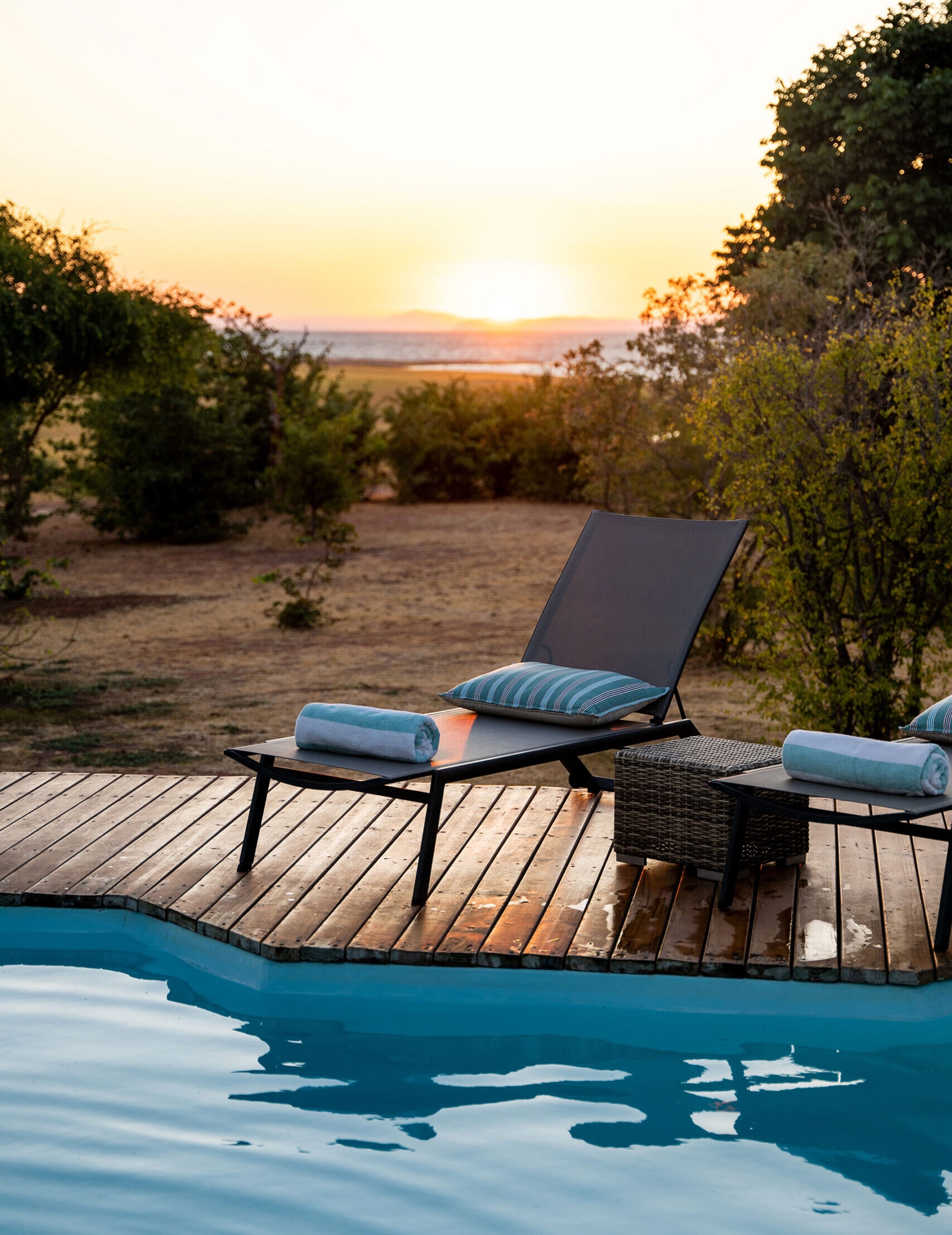 From the camp’s position on the banks of the river, you can see the Great Rift Valley on the opposite side of the Zambezi, a view which you can take in from the comfortable star-gazing deck. Each of the ten tented rooms have indoor and outdoor showers. And there’s a dining and lounge area, plus an infinity pool for cooling off after a safari.