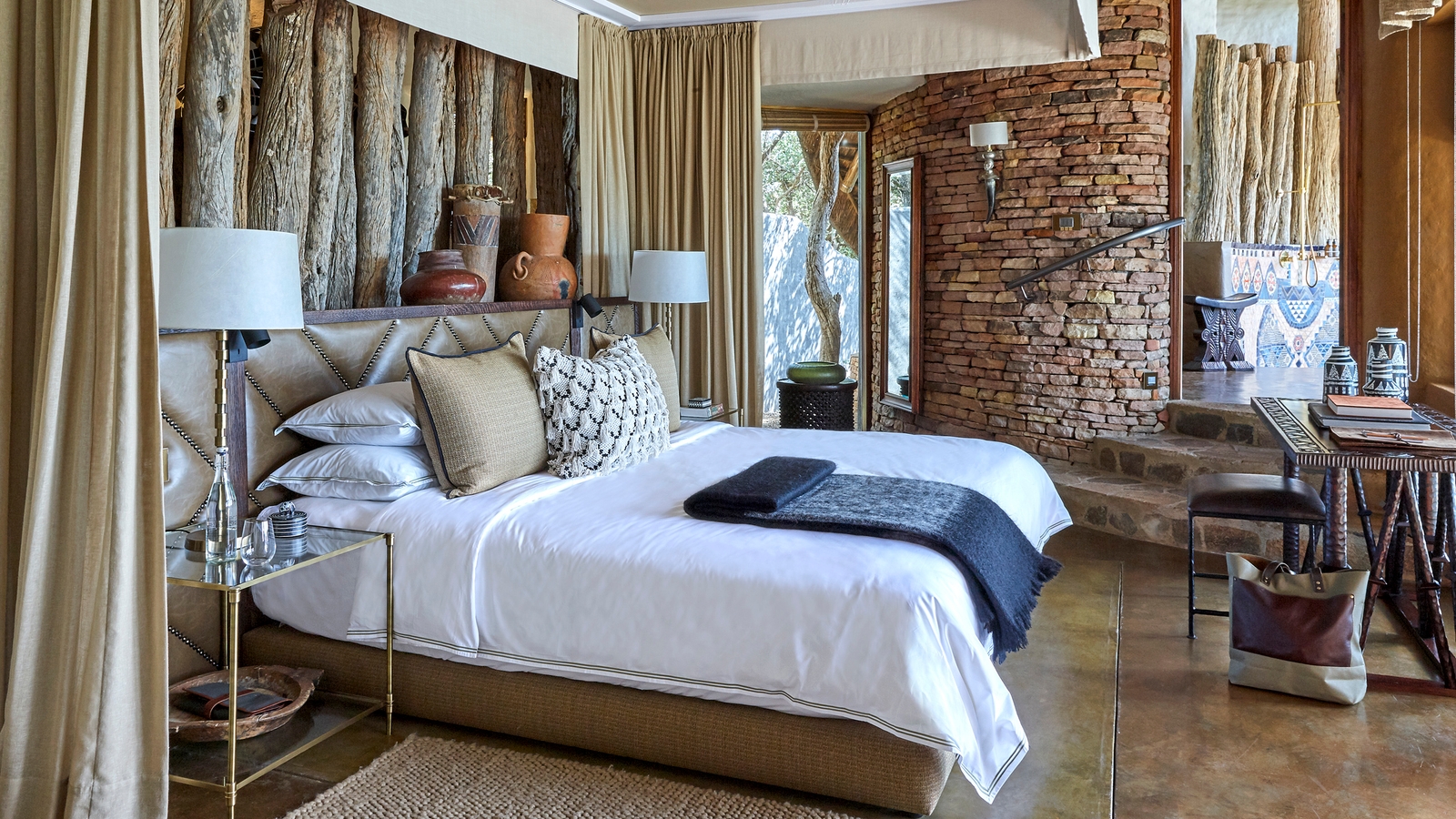 Thatch palapa-style buildings reach up through the trees and descend to heavily overhang its open-sided sitting rooms and dining areas for far-reaching views and the African essence of blending the outside with indoors. Loud ethnic patterns weaving themselves between soft earthy hues, inviting traditional furniture, local art and antiques decorate the lounges, spilling into the luxury suites of this lodge.
