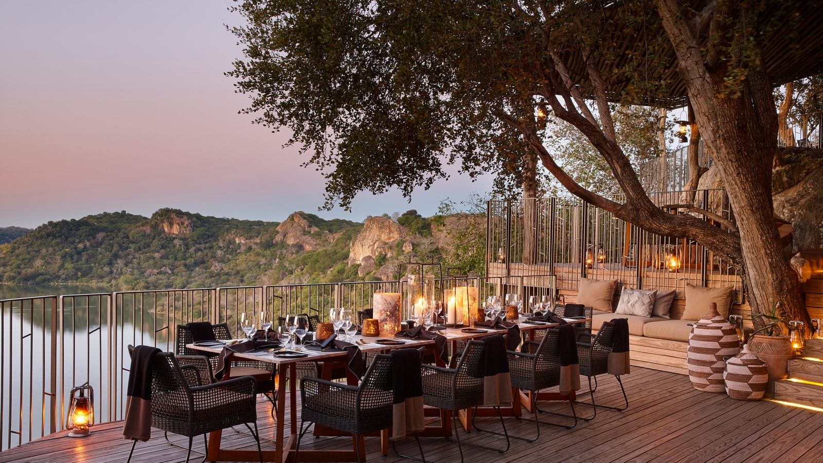 Thatch palapa-style buildings reach up through the trees and descend to heavily overhang its open-sided sitting rooms and dining areas for far-reaching views and the African essence of blending the outside with indoors. Loud ethnic patterns weaving themselves between soft earthy hues, inviting traditional furniture, local art and antiques decorate the lounges, spilling into the luxury suites of this lodge.