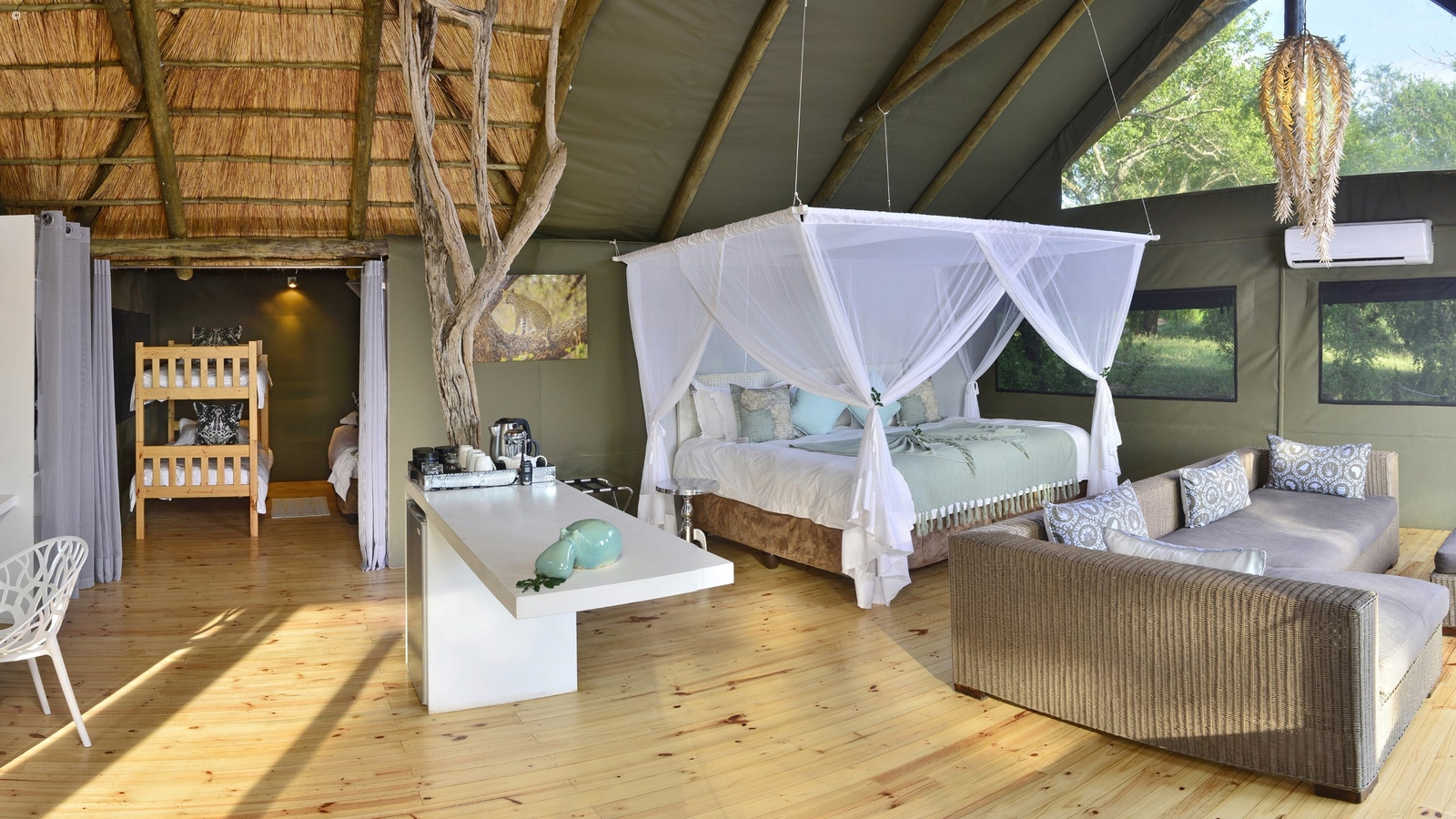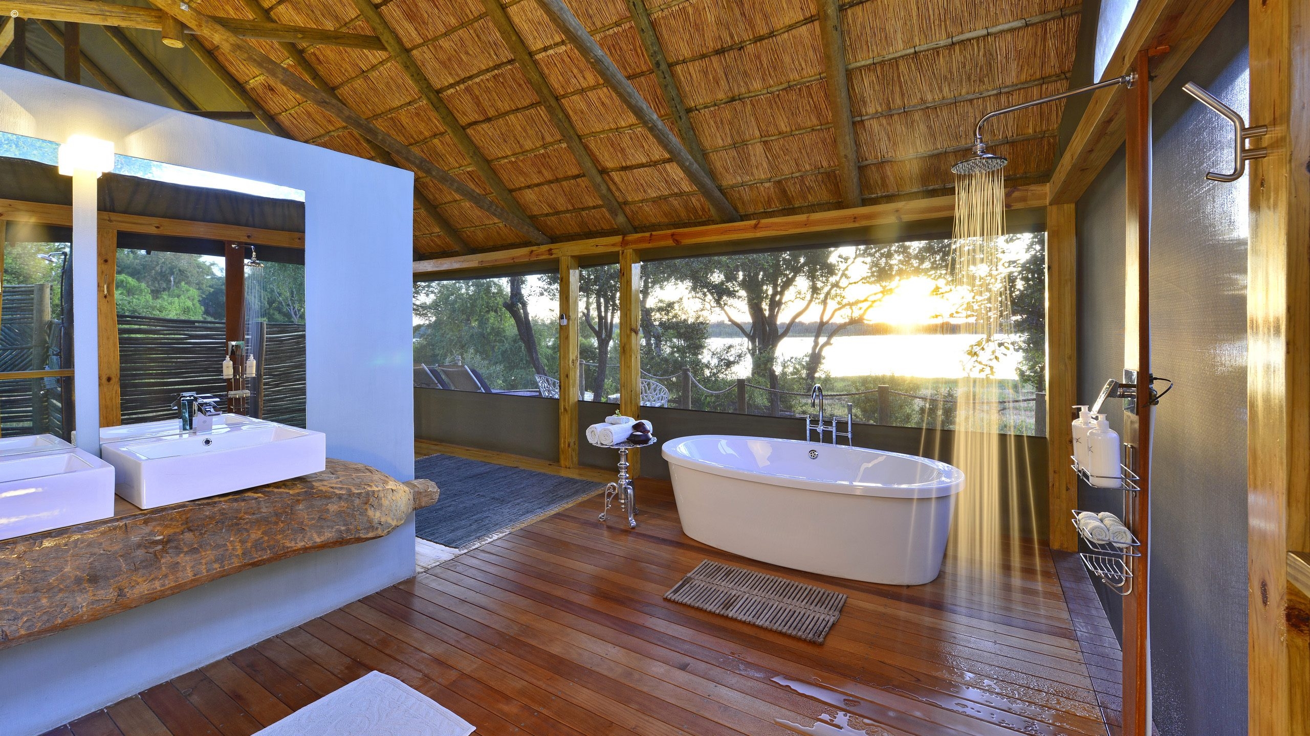 With thirteen vast tented chalets with contemporary style twists and modern amenities, you awake with folding back your canvas door, strolling onto your private wooden terrace, to be greeted by wild nature and sublime river views. Five of these feature a children’s room and all are to feature their own plunge pools out on private decks overlooking the Zambezi.