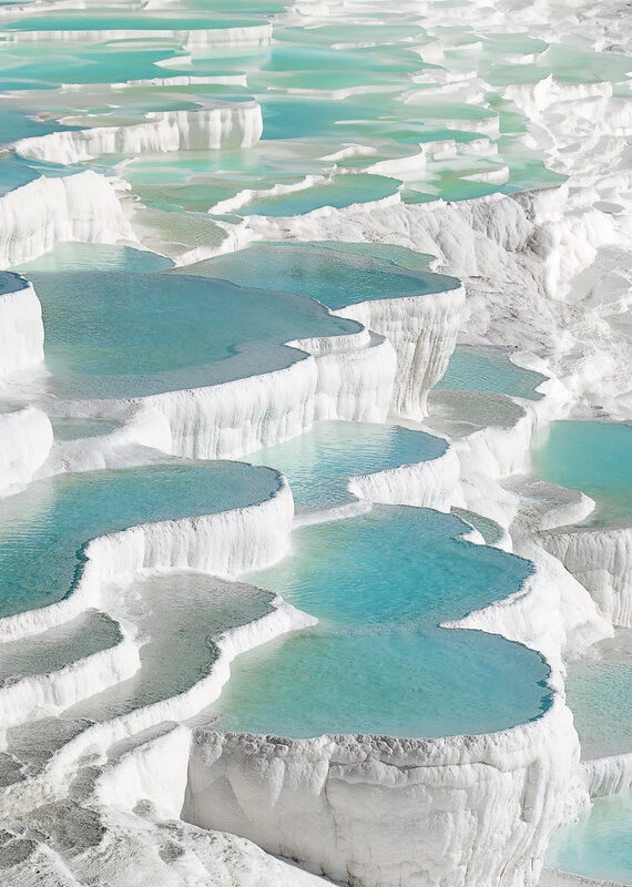 In Turkish, the word pamukkale means ‘cotton castle’ – which might seem like an unlikely name for a group of 17 thermal hot springs. But when seen from afar, the white limestone terraces and ice-blue pools do indeed resemble a castle made of cotton fluff or perhaps puffy clouds.