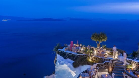 The Greek island of Santorini is legendary for its jaw-dropping views, and Lycabettus may be the best place to drink them in. Its incredible terrace is set on the edge of a cliff, creating the sensation of being suspended over the iconic caldera. Here you can savour delicious haute cuisine at sunset or under the stars with the one you love.