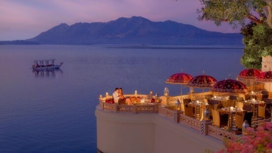 You and your partner will eat like Indian royalty at Sheesh Mahal, a stunning outdoor restaurant overlooking Lake Pichola in Udaipur. The black-and-white tiled floor, candlelit tables and glowing lanterns create a sense of classic glamour, while the regional cuisine strikes a thoughtful balance between tradition and creativity.