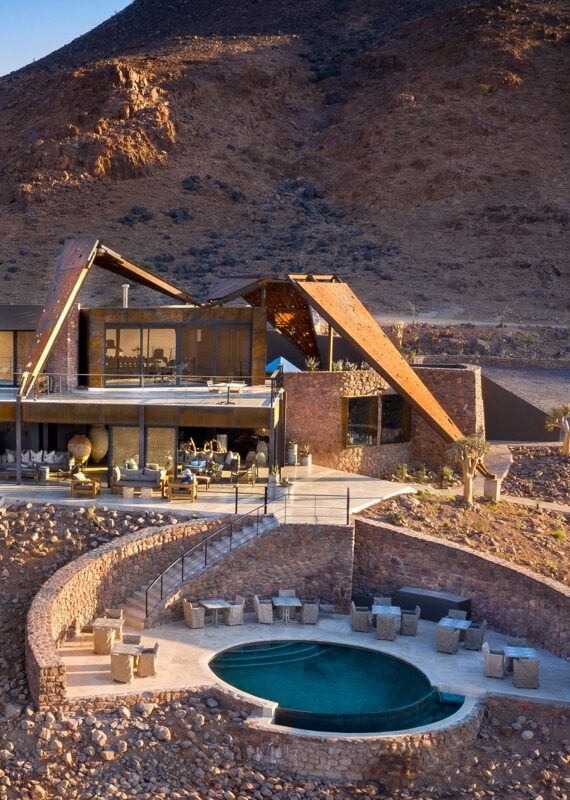 Amid the undulating red dunes of Sossusvlei, you’ll find our favourite hotel in Namibia. Sossusvlei Desert Lodge is a sanctuary of solitude in the depths of the desert, with ten sleek villas promising complete privacy and unparalleled views. Lose yourself in the infinite wonders of the night sky as you gaze up through your villa’s star-viewing skylight, or head to the main lodge to sip on a glass of wine from the walk-in cellar.