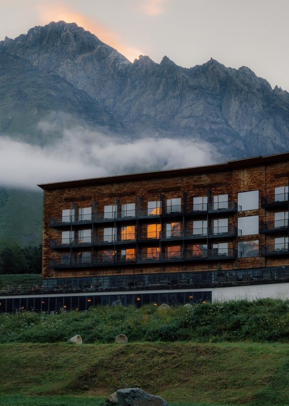 The hotel is reminiscent of a classic mountain lodge, with an elegant lobby bar, a sumptuous lounge and a restaurant serving the finest Georgian comfort food and qvevri wine. Spacious balconies in each room offer views of Mount Kazbek or the sun-dappled forest.