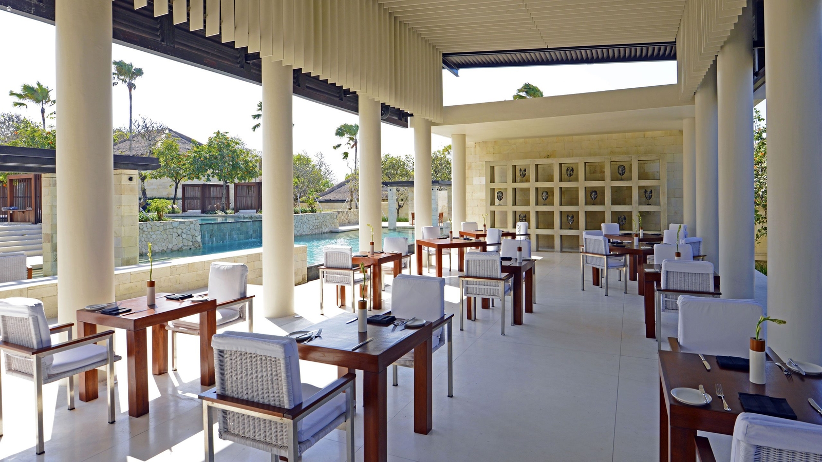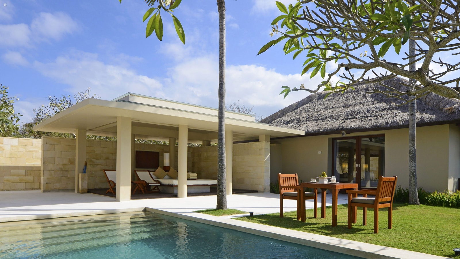 Just five minutes’ walk from the beach and a 15-minute drive from the international airport, The Bale is a well-positioned modern tropical retreat. Its collection of very spacious pavilions are decorated in a sparse, contemporary style with private pools with the added bonus of enjoying its beach club on Geger Beach.