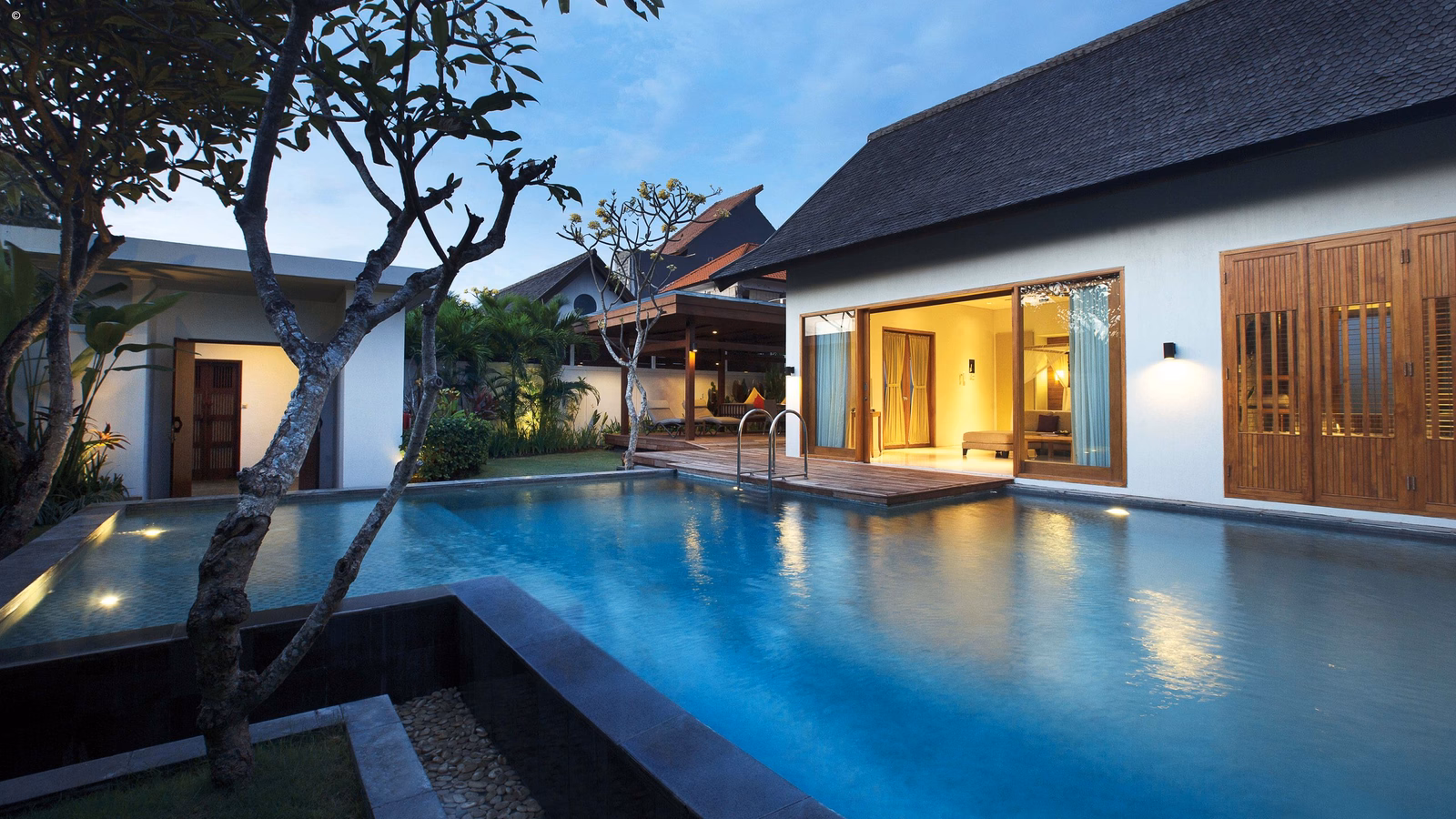 The rest of this intimate hotel is inspired by traditional Balinese architecture yet constructed in a modern design, based upon space and light. The hotel has an open-plan design that allows natural light to flood its communal spaces, plus a landscaped pool area leading to the beach in front. At night, carefully positioned lamps give the hotel a soft-lit ambiance.
