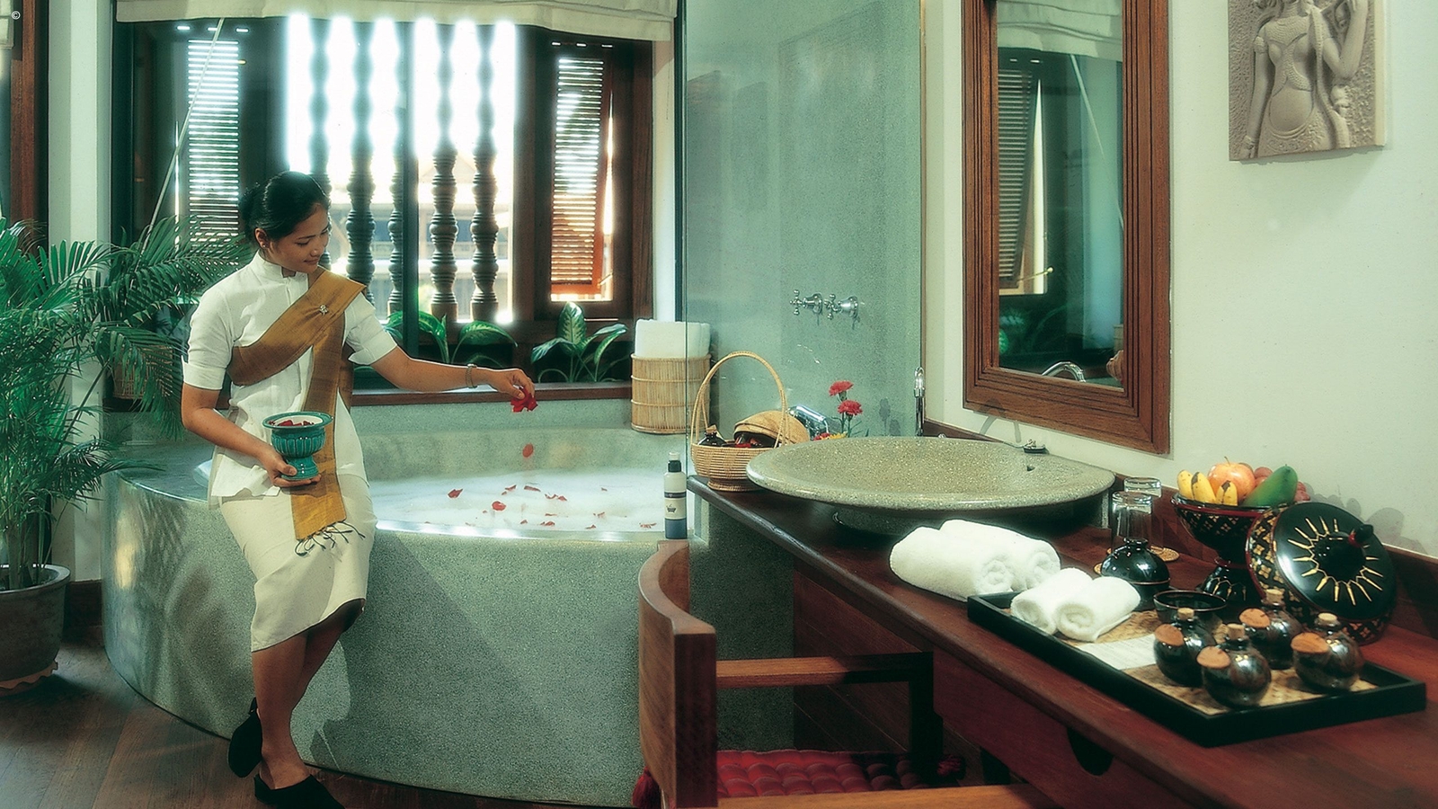 This hotel’s high walls hide vibrant, fragrant gardens filled with bougainvillea, frangipani and soaring palms that are La Residence D’Angkor’s enchanting setting.