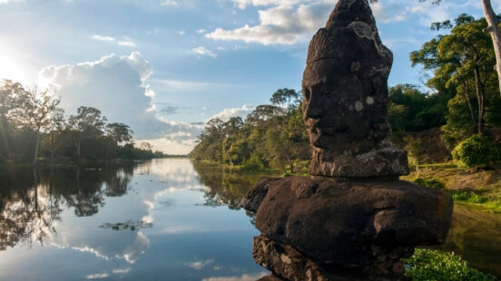 While Angkor Wat is the centrepiece of Cambodia’s temples, Angkor Thom is also worth exploring. A private tour of this ethereal complex allows travellers to explore the hidden nooks and crannies. To begin, you’ll travel by road to the Victory Gate leading into this complex, before continuing by foot along the city wall. En route to the Terrace of the Leper King, you’ll then stop briefly to see an imposing statue found in Bayon which is now displayed at Vihear Prampeilveng temple.