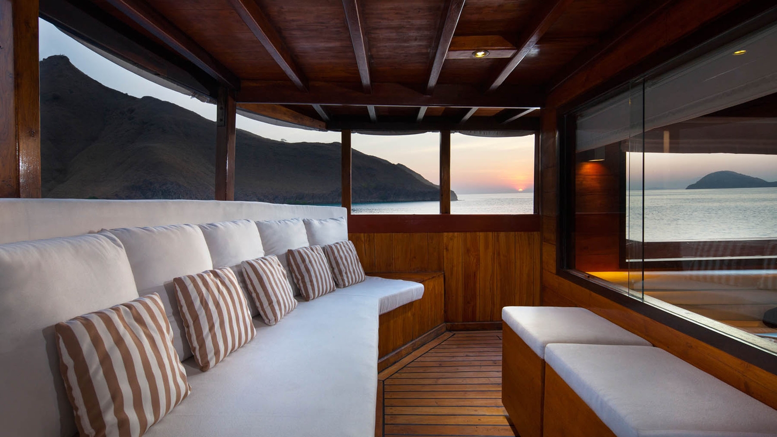 The 42 metres (138 feet) long Samata is a traditional wooden phinisi yacht on first appearance, but inside it is a thoroughly modern vessel with three decks, open-plan living and French inspired design.