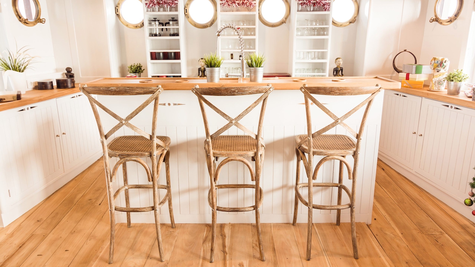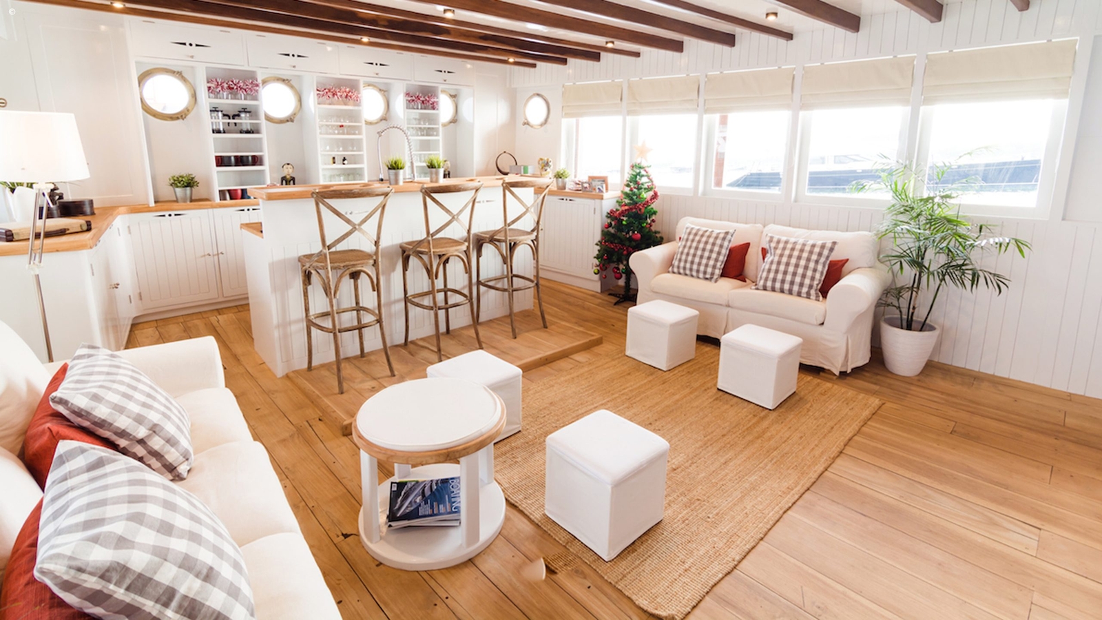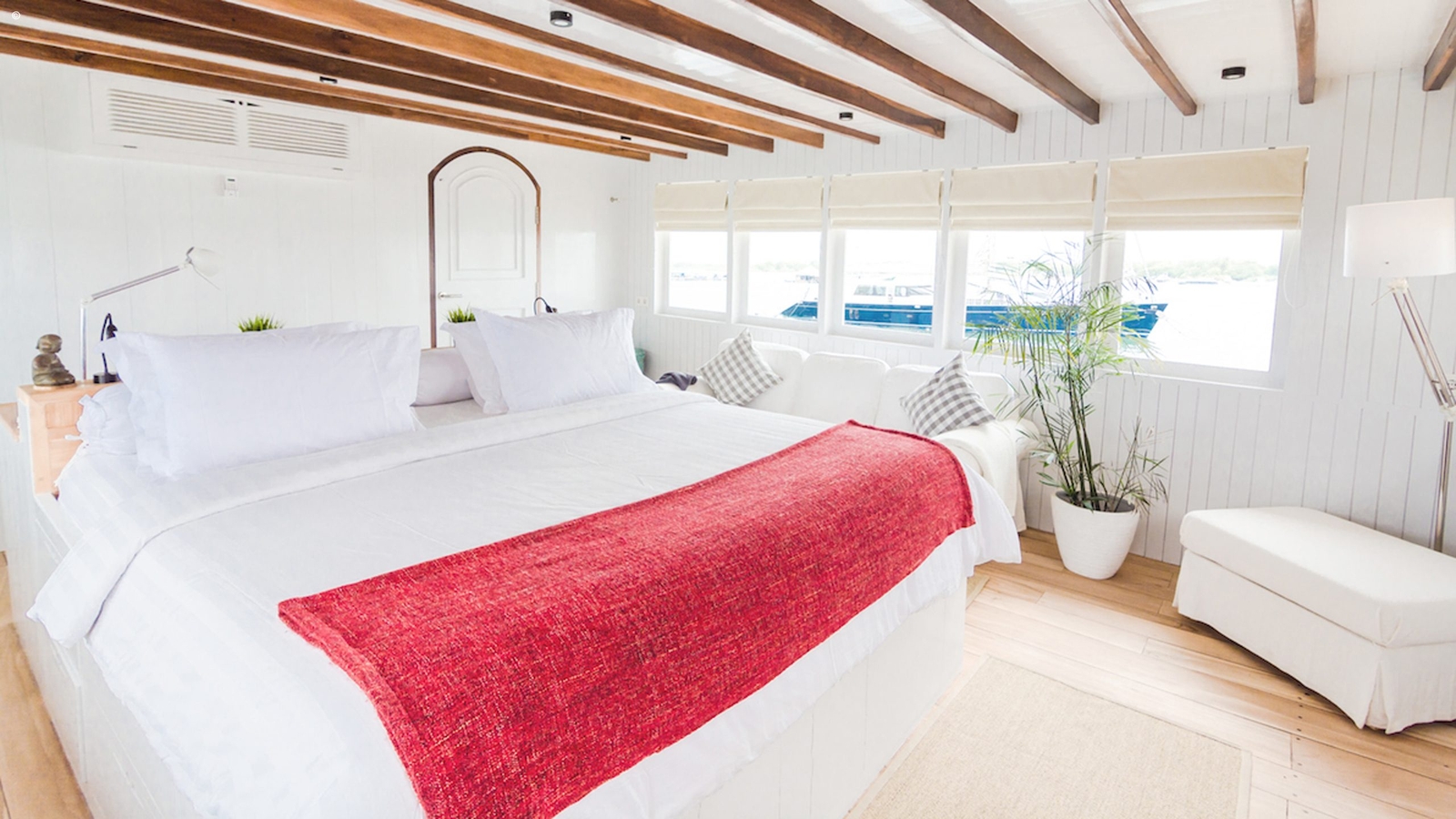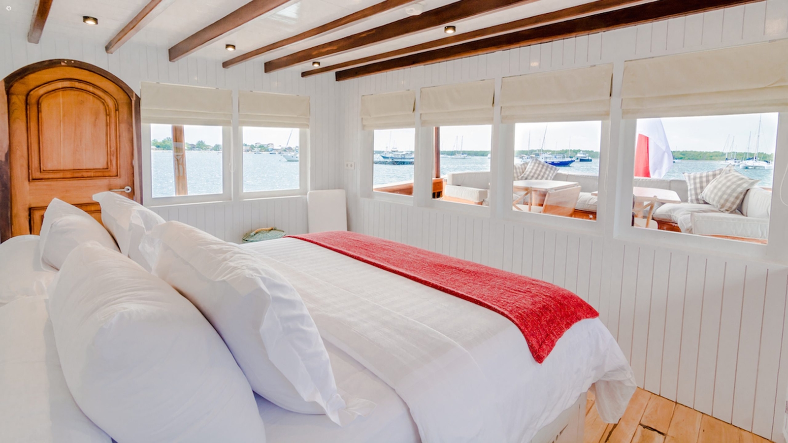 Spacious and elegant, the vessel features three en-suite cabins positioned above the deck. Large windows allow plenty of natural light and means guests can enjoy the wonderful views while cruising through the emerald waters. Cabins feature natural teak floors and a sophisticated colour scheme of cream with flashes of red.