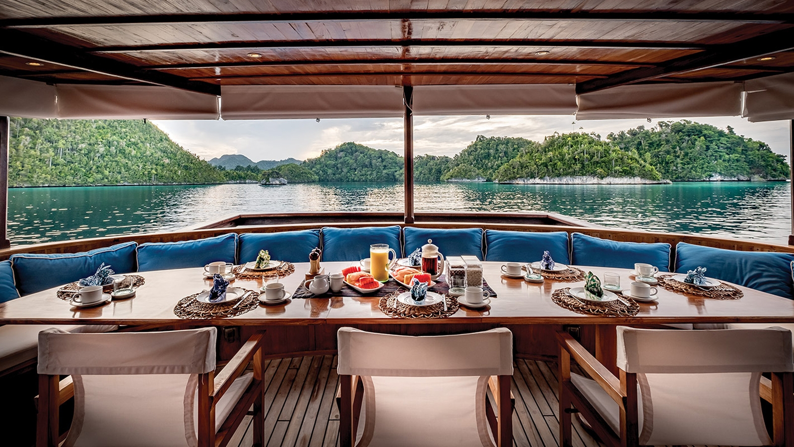 Each positioned above deck, with wooden furnishings, local artwork, and tropical patterns, the cabins are individually decorated. Spacious and airy, every cabin has air-conditioning, music systems and flat-screen TVs. Bathrooms are sizeable, with tailor-made fittings and hot water showers.