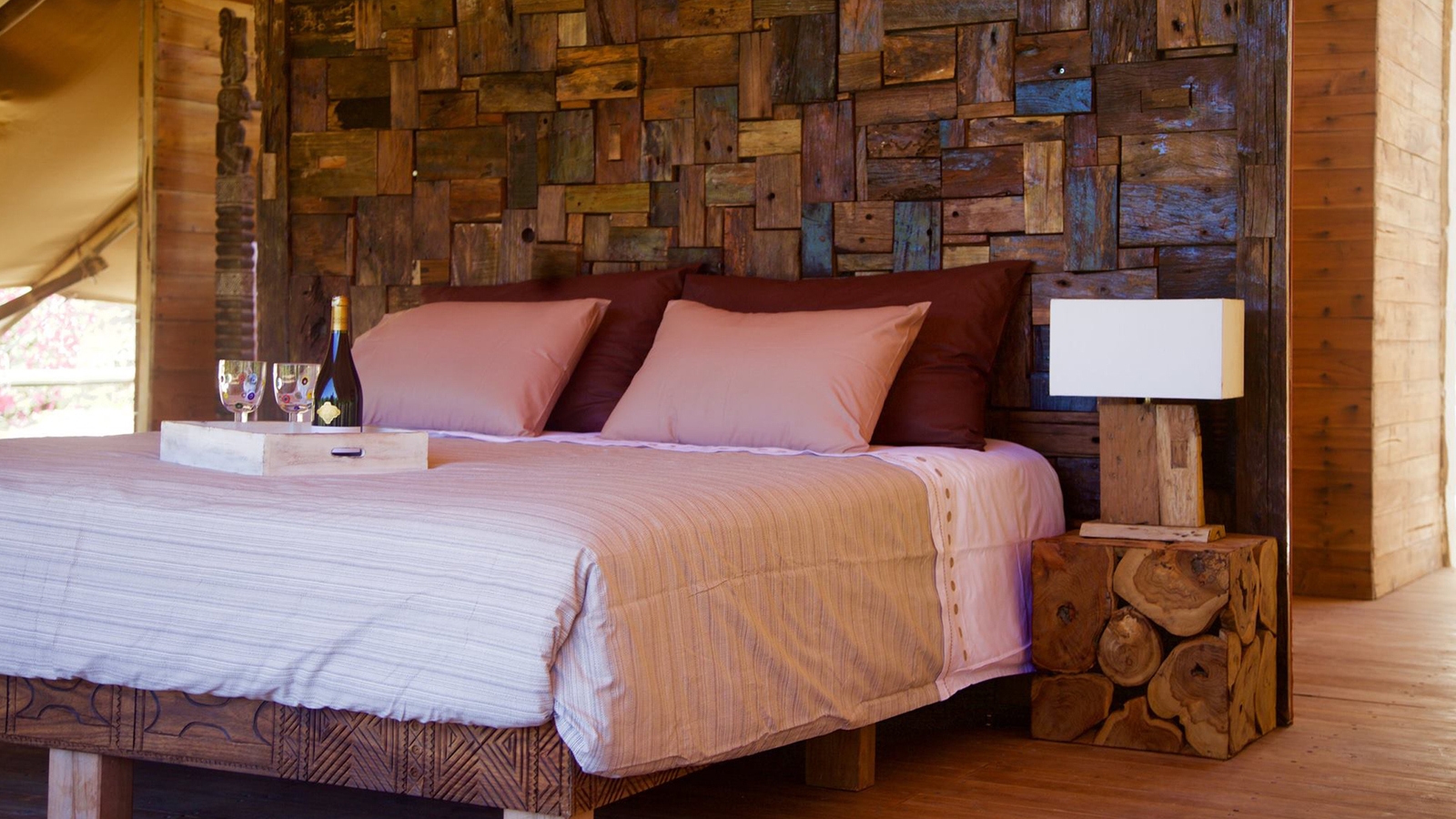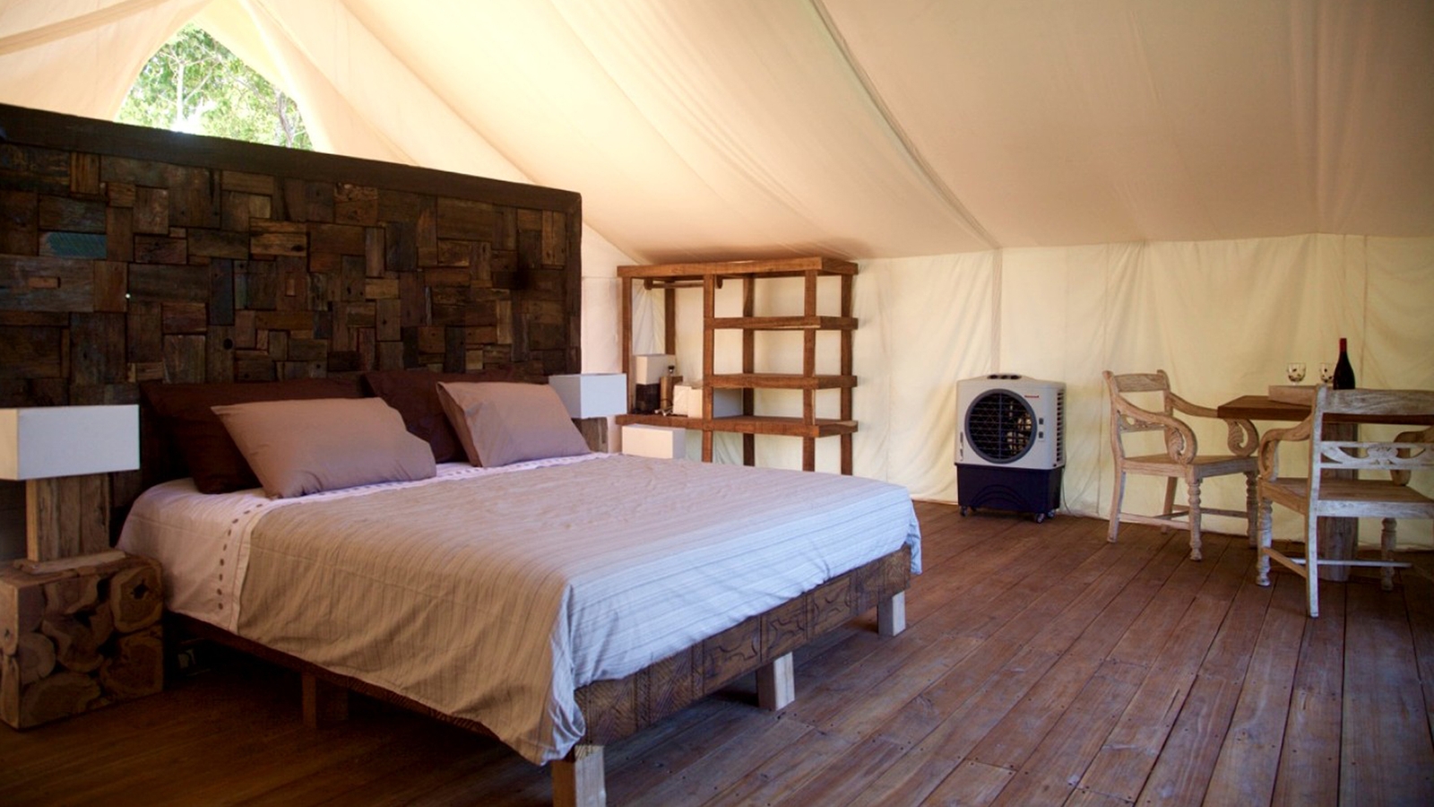 Four luxury tents are nestled amongst lush green forest, looking out over sparkling water and secluded coves. The tents feature stone walls and canvas exteriors and are beautifully furnished with lots of natural materials that reflect the surroundings.
