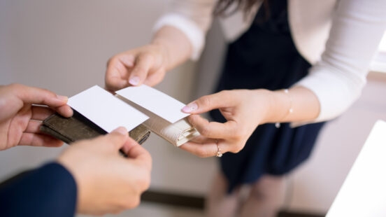 Offer your business card with two hands whilst facing the recipient, and accept cards in the same manner, remembering to look at the card before you put it away.