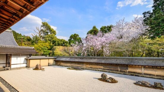 To escape the hustle and bustle of Kyoto, travellers can head to nearby Arashiyama. Begin your time here at the unique and quiet Otagi-Nenbutsuji Temple, famous for housing 1200 Rakan figures that were carved by worshippers to pray for the prosperity of the temple. Just past Arashiyama lies Okochi Sanso, a splendid mountain retreat set amongst beautiful grounds. During sakura season, this best kept secret is particularly beautiful and only enhanced by the fine views of the city below. An even more impressive view of cherry blossoms can be found at Arashiyama’s Tenryu-ji Temple, the head temple of the Tenryu-ji branch of Rinzai Zen Buddhism. Strolling through the pond and garden or along the nearby Togetsukyo Bridge are both excellent ways of taking in some impressive sakura sights.