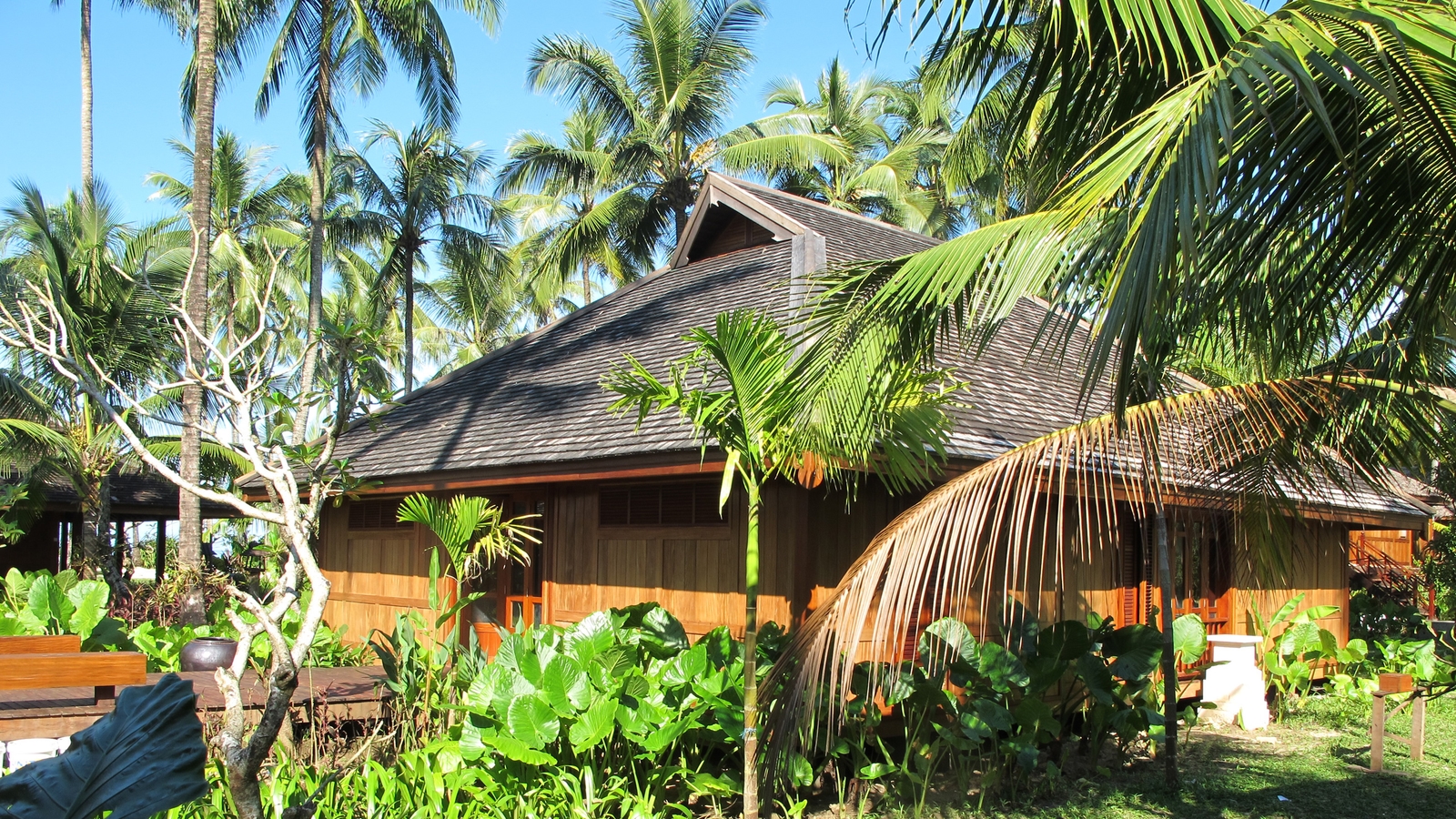 There are 28 bungalows of traditional style with thatched roofs, all tucked into a large palm grove, affording guests a welcome level of privacy. Each one has views of the sea and the mountains from their terraces, and are all air-conditioned, with spacious living areas.