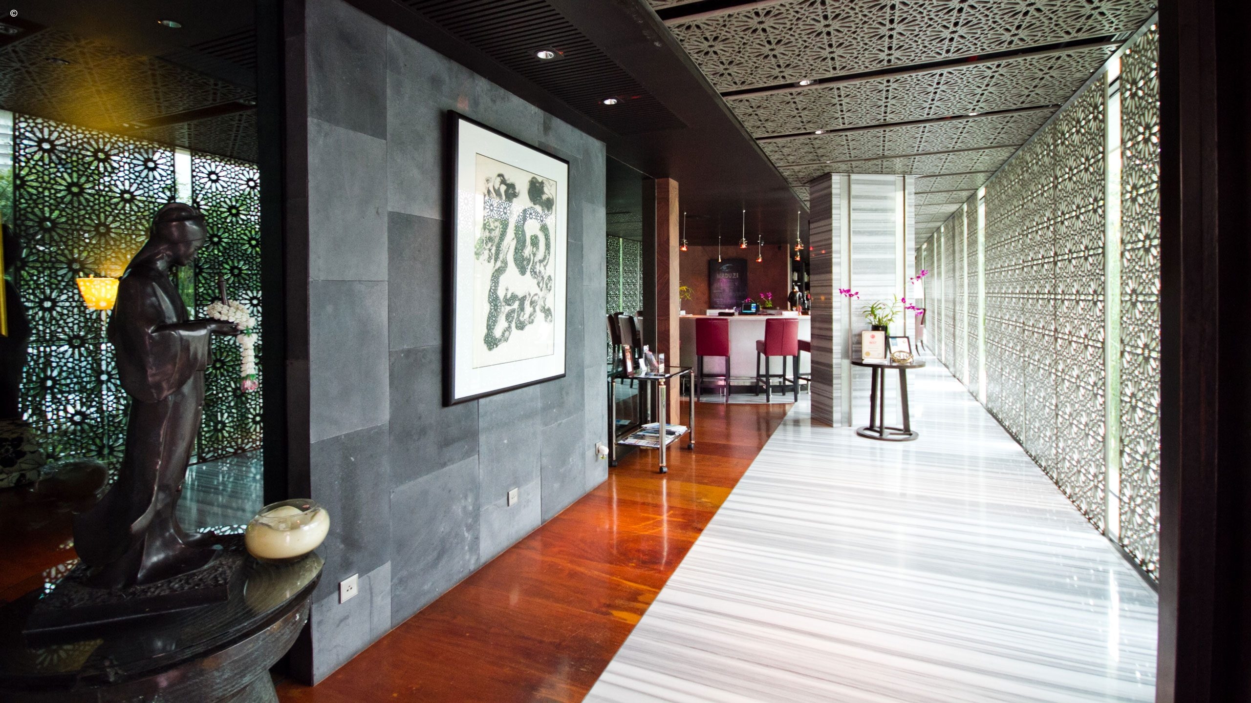 The Ma du Zi restaurant, with Japanese chef Yuya Okuda at the helm, serves French cuisine fused with oriental influence. Either take a seat on one of the red leather stools at the white circular hotel bar and enjoy cocktails, or withdraw into a more secluded setting in the Tea Room.