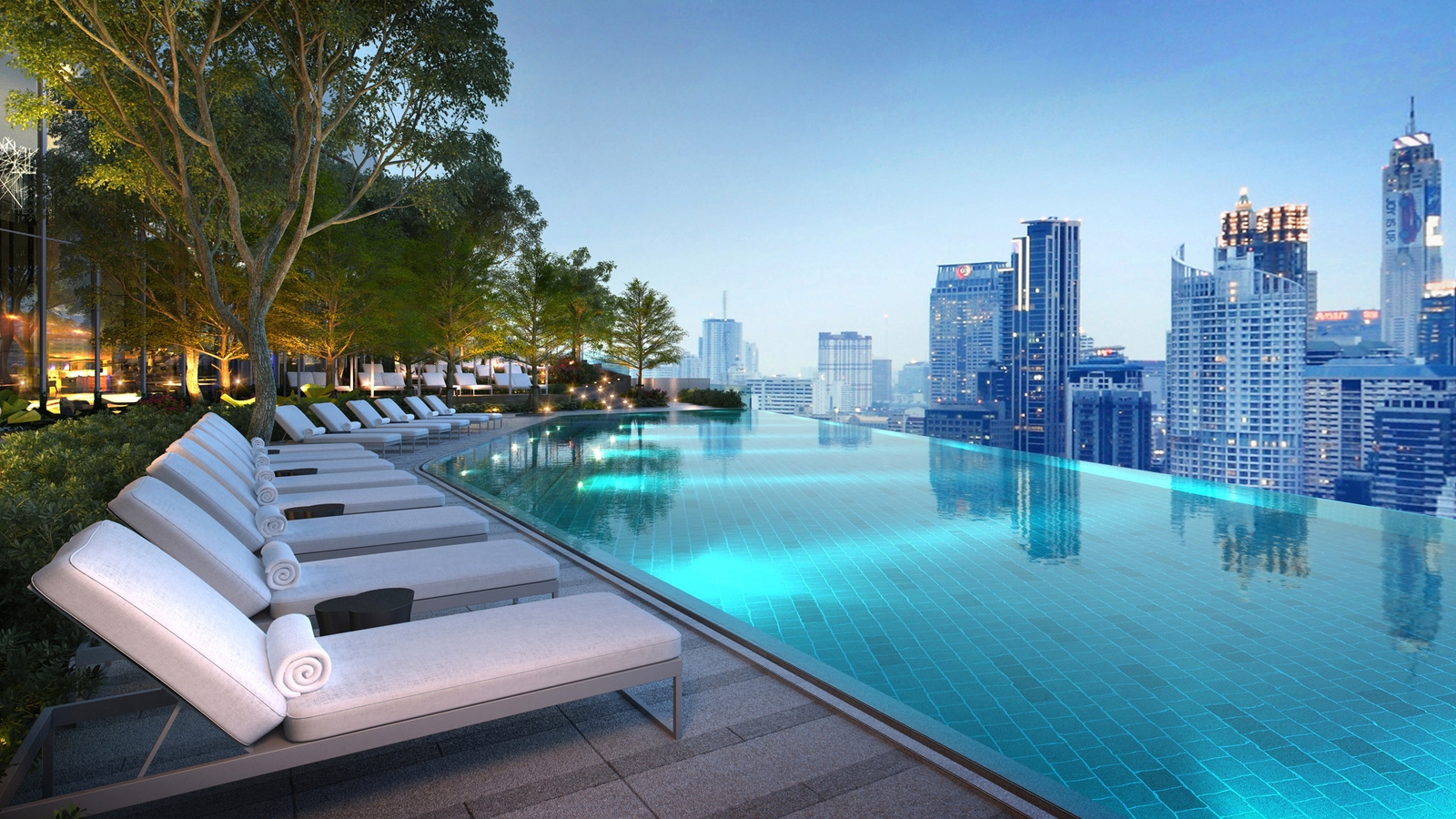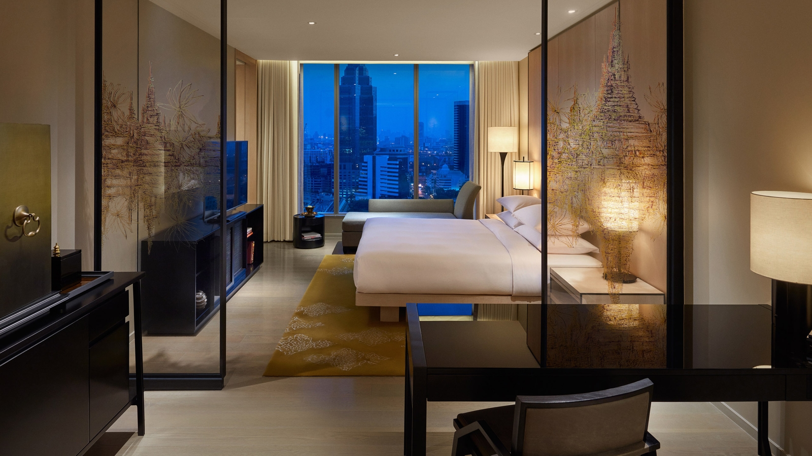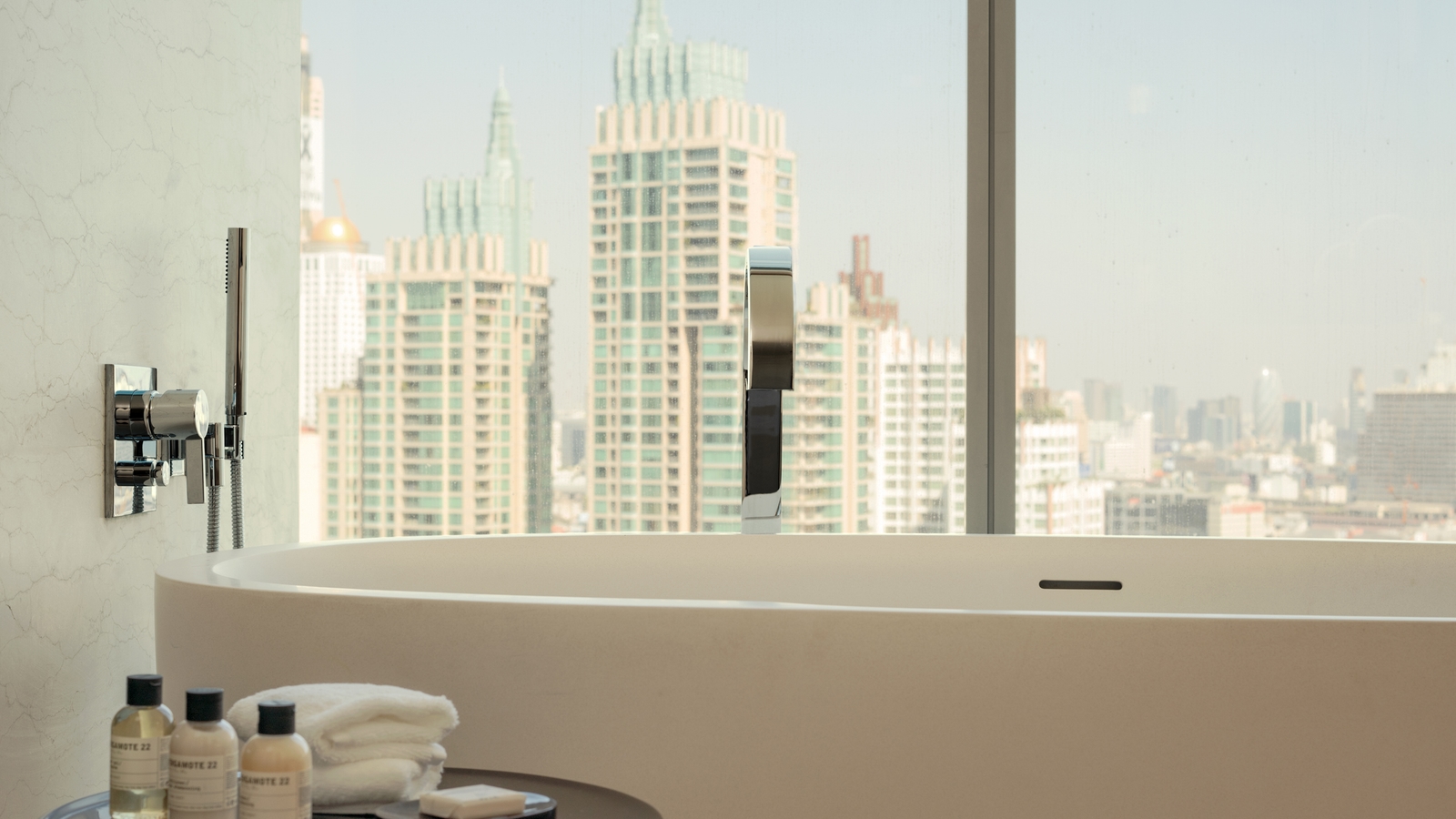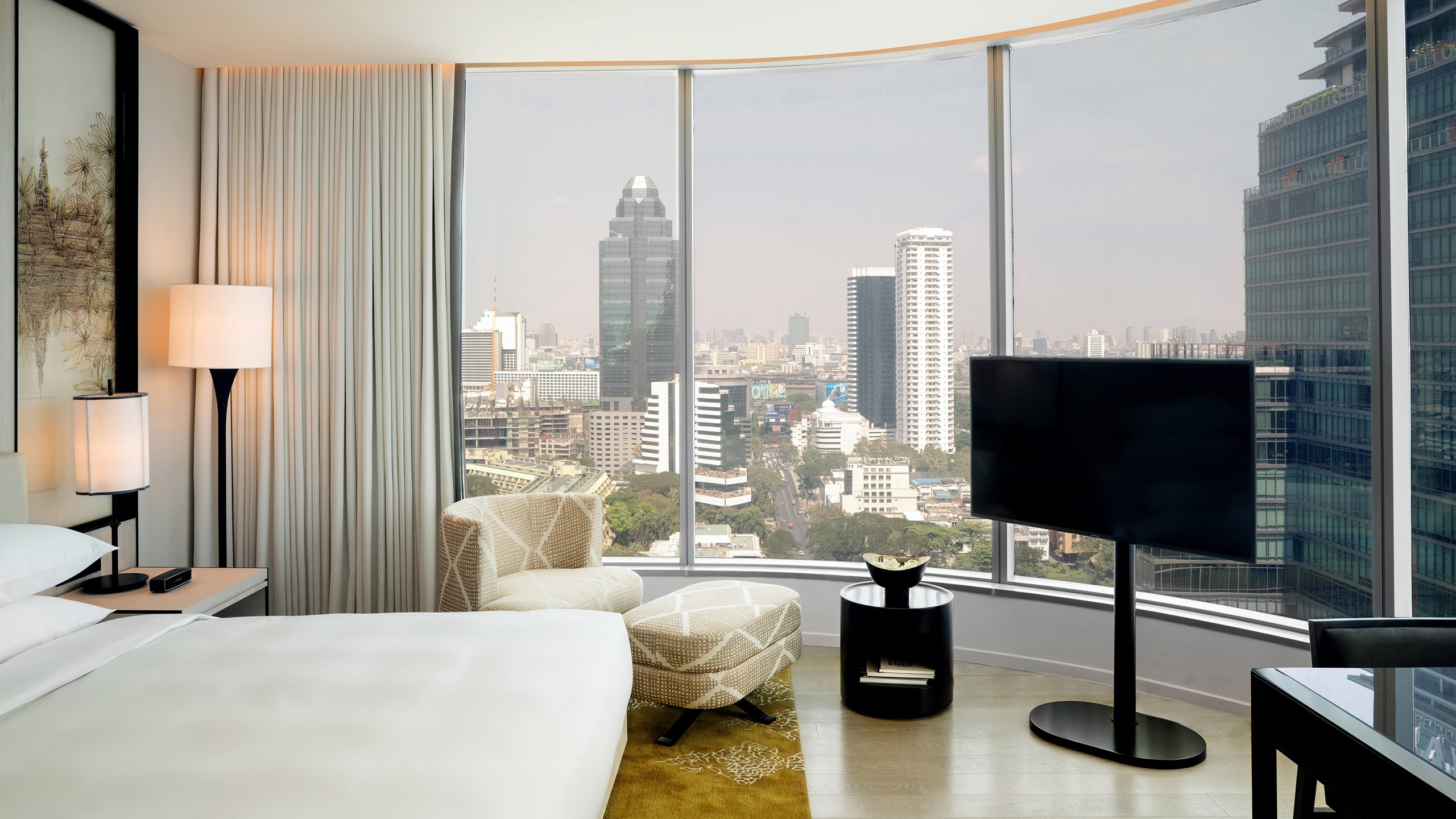 There are 222 rooms and suites, all with spectacular views of the city skyline. Decor is elegant with neutral colours and timeless Thai accents. Bathrooms have been made to feel like private spas, with bath tubs and separate rain showers.