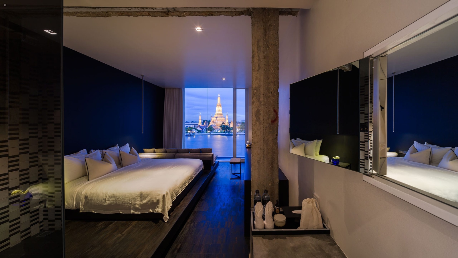 Seventeen rooms, mostly with a spectacular view across the Chao Phraya River to Wat Arun (although a few face the small approach road), are modern with a minimalist design theme. The roof top bar and restaurant, serving mainly Asia specialities, enjoys the same view that becomes especially picturesque at night.