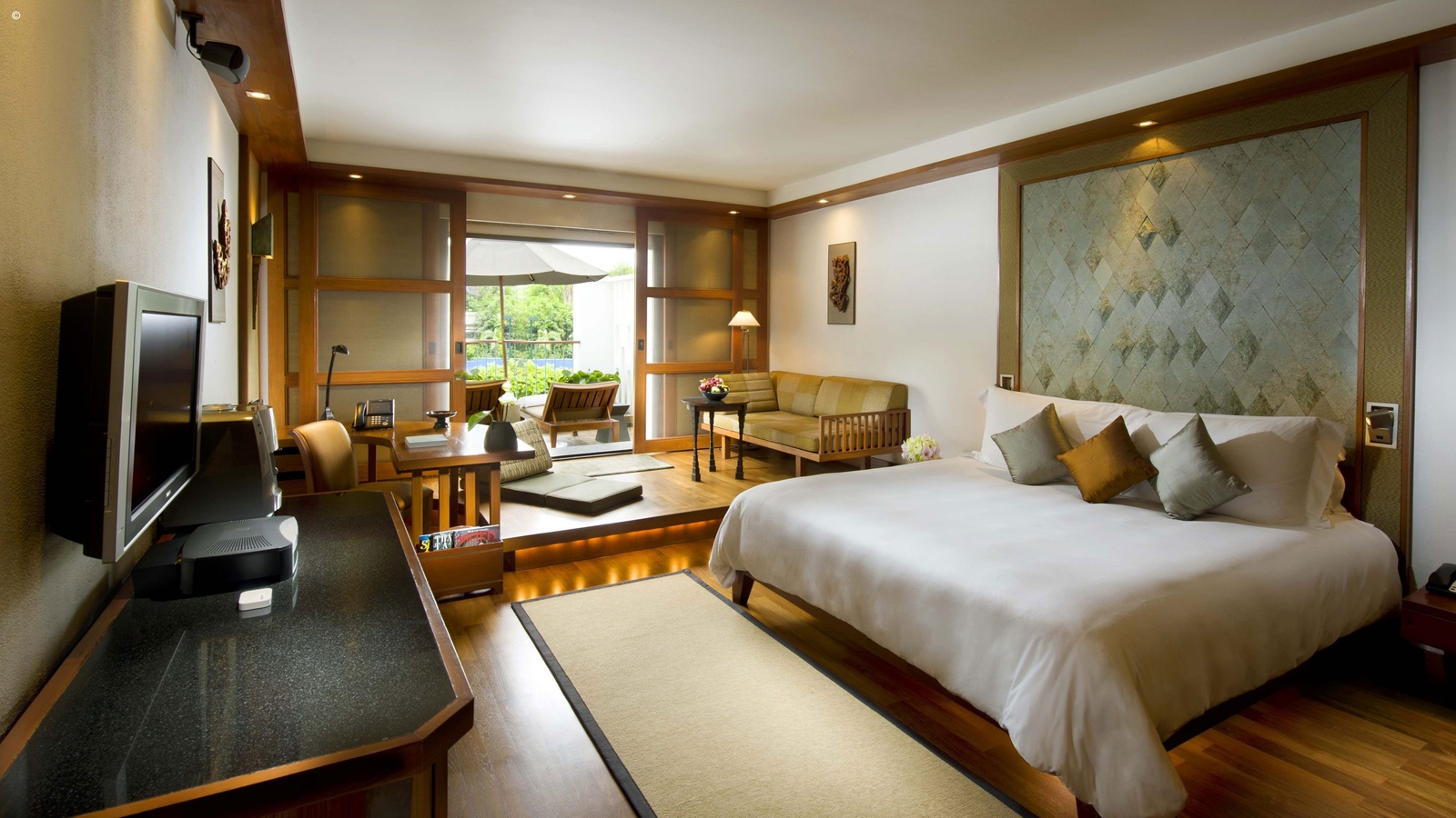 The hotel takes great pride in its excellent service and seeks to go as far as possible to reflect the legendary Thai hospitality in all areas of its business. Each comfortable guest room faces an inner courtyard area, adorned with lily ponds, and is furnished in teak wood and Thai silk. Your room will feature an oversized bathtub and king-size bed. If you’re looking for a palatial amount of space then book into one of the many suites, with open-plan layouts and a host of special facilities such as terraces, gardens and glass-walled bathrooms.