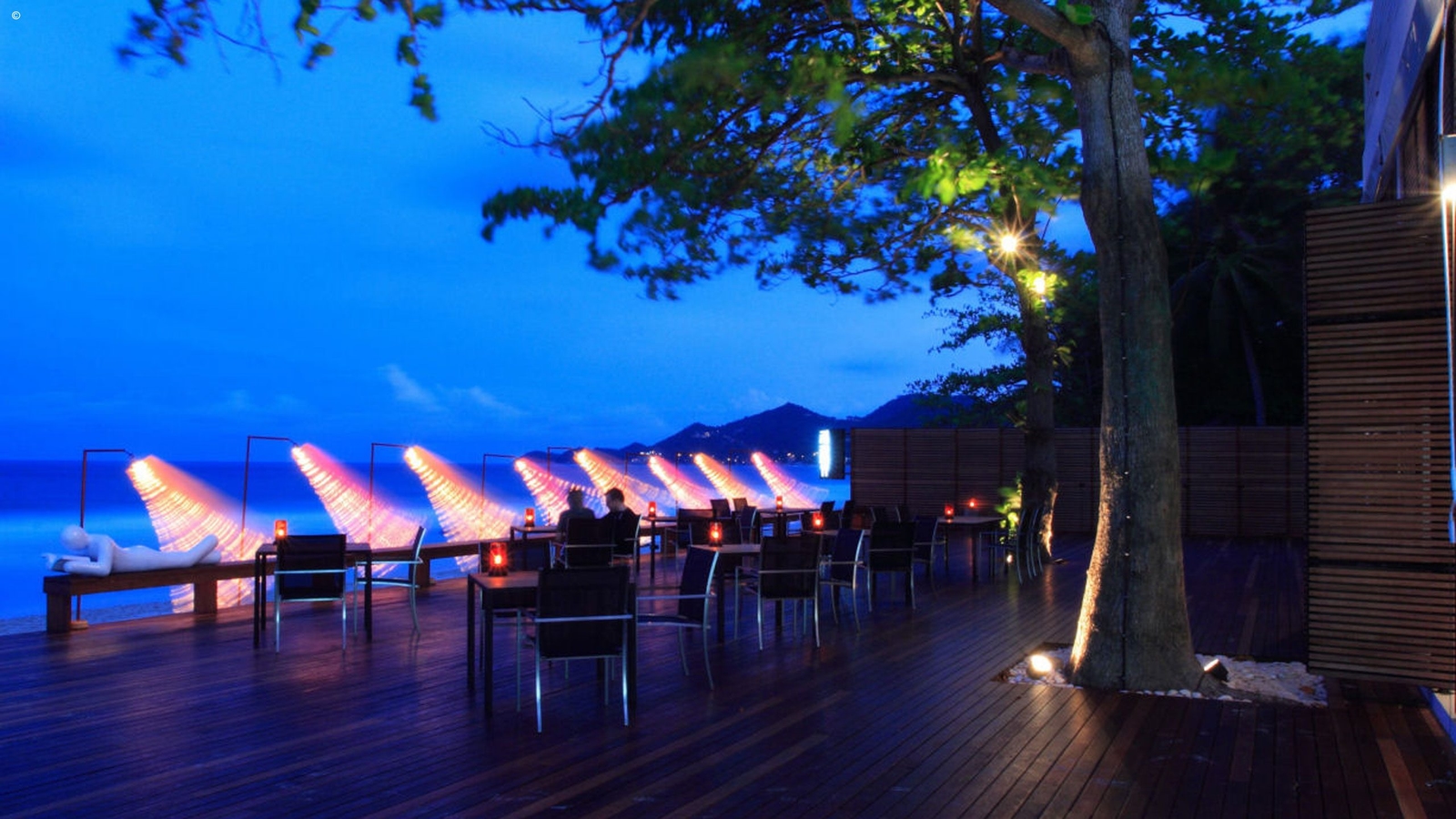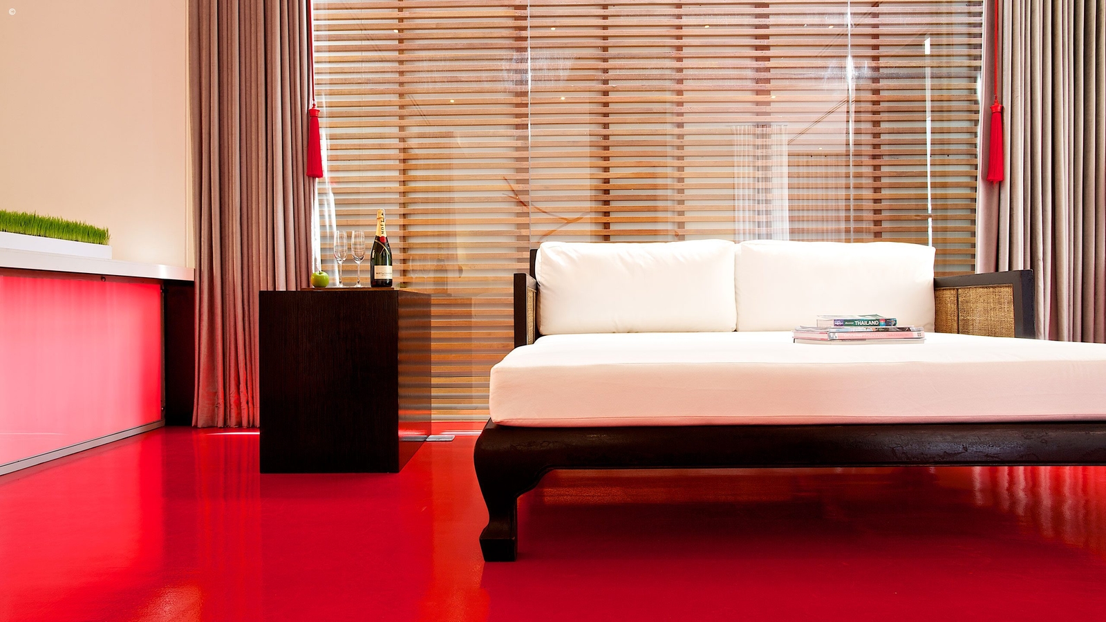 The hotel is themed around its central building, the library itself, which contains within its stark white walls a modest collection of carefully-curated books and DVDs to peruse in an afternoon of light-entertainment. This is then offset by the brilliantly red swimming pool outside – the second signature feature – and the blue waters of the sea beyond. There are two restaurants and a beach-bar on site, providing sophisticated Thai and international fusion cuisine in a characteristically modern setting. Romantic dining on the beach itself is also a possibility.