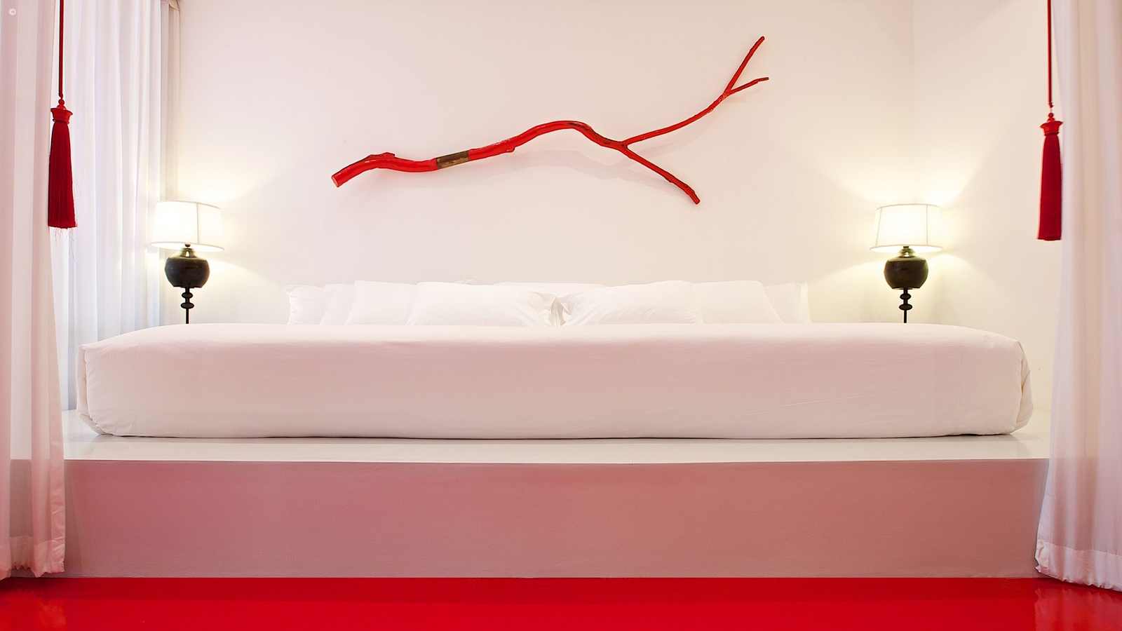 The studios and suites available are best described as minimalist, with sleek white walls and angular lines throughout. This is somewhat contradicted by the bright red flashes of colour throughout the hotel but the design is nevertheless clean and modern, offering space, light and sophistication in equal measure. All rooms come replete with king-sized beds, large bathtubs and private terraces.