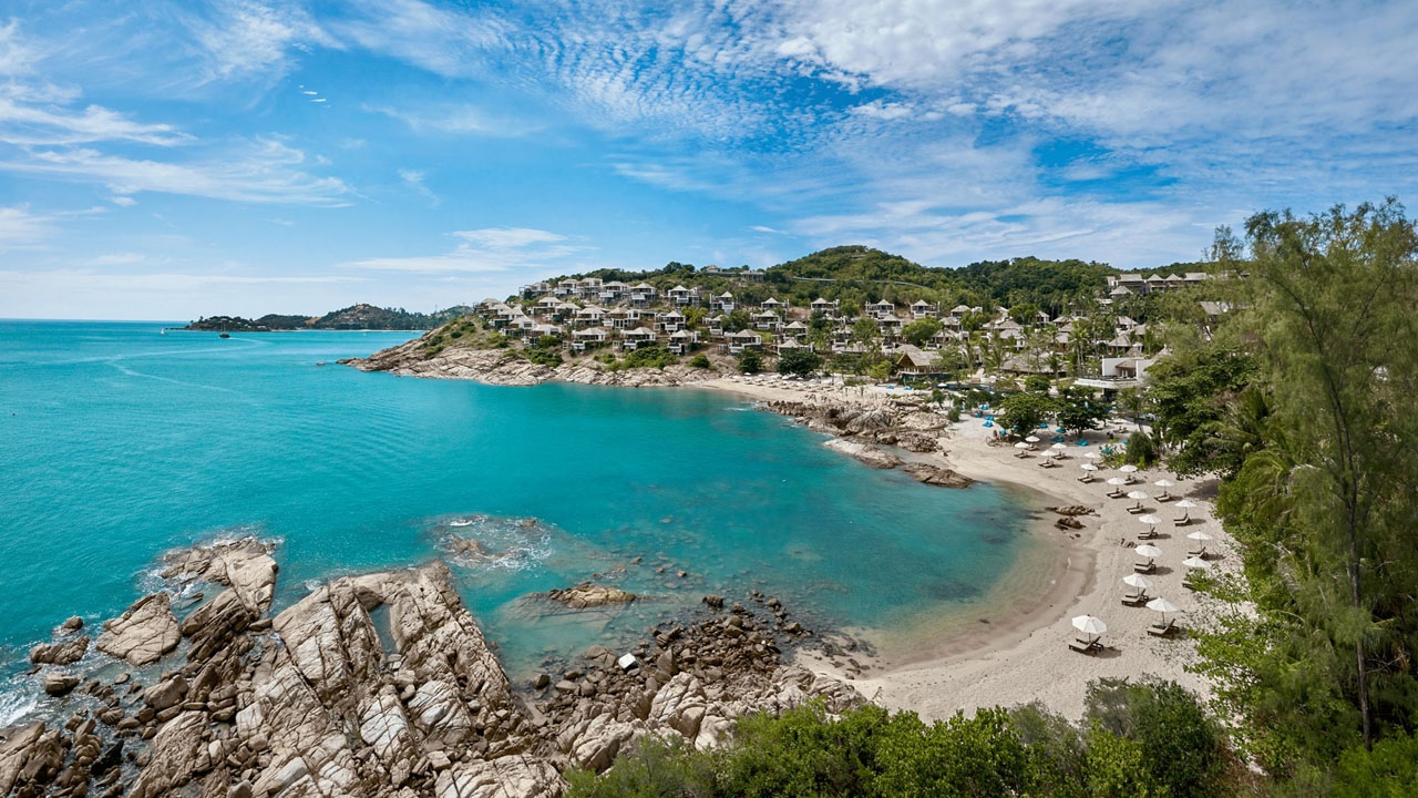 The Ritz Carlton Koh Samui is nestled in a private bay on the stunning Thai island of Koh Samui. The elegant hotel offers 175 exquisitely designed suites and pool villas, as well as six dining experiences. Two secluded beaches offer white sand beaches from which to enjoy the emerald waters of the Gulf of Thailand.