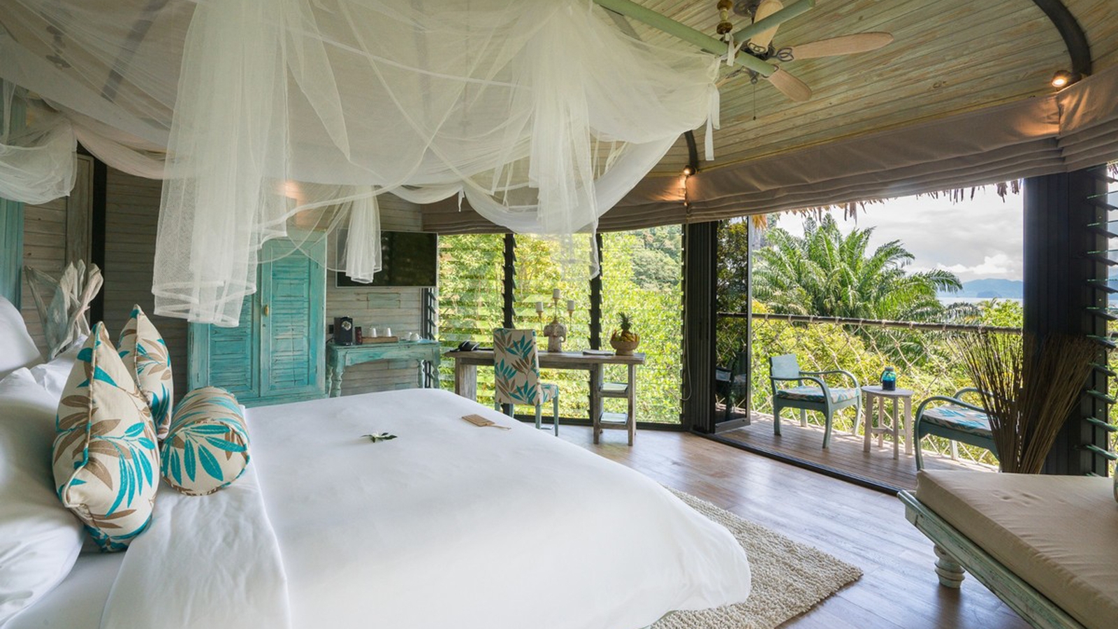 Cross a suspended bridge to reach your duplex treehouse which boasts an open-plan lower floor with a private plunge pool, dining area, personal bar, double swing and day beds. The villas are decorated in a shabby-chic style, incorporating colours and textures from the jungle and the sea. Upstairs, in the bedroom, a balcony looks out over the treetops. Soak in a hammock bath or refresh yourself in a jungle shower.