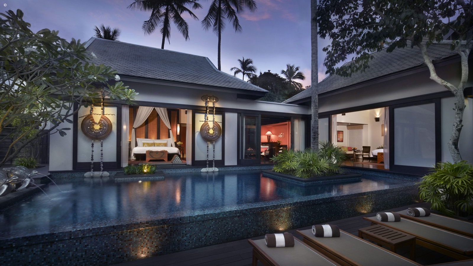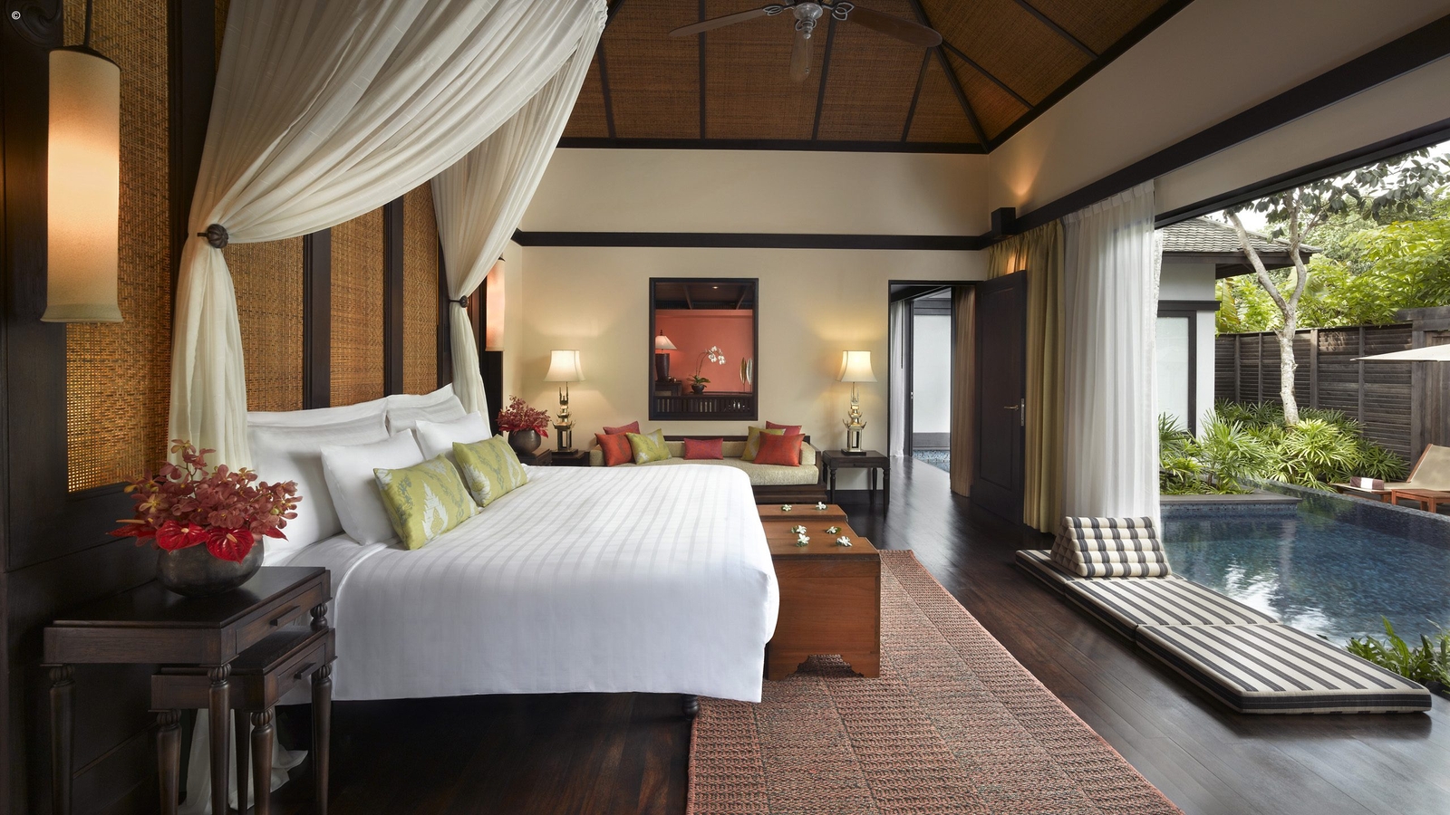 There are 91 sophisticated private villas, each with their own pool, all large, airy and classically Thai with huge windows, light fabrics and dark woods.