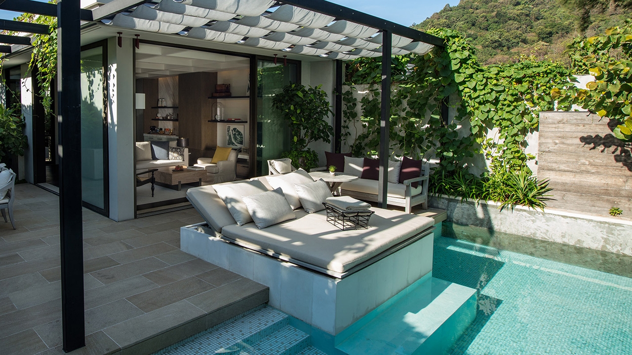 The hotel features 71 pavilions and villas hidden among the tropical vegetation just moments from the beach. Floor-to-ceiling windows flood rooms with natural light, and a soft neutral colour schemes gives a contemporary, fresh feel. All villas and pavilions come with private pools and outdoor space in which to relax.