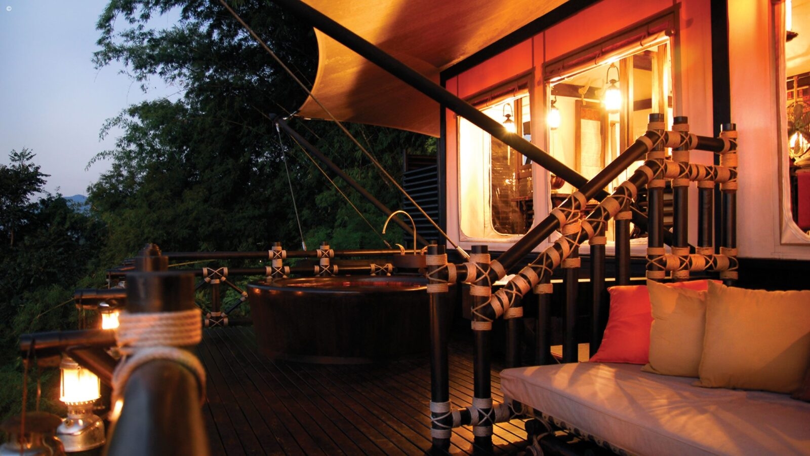 Arrive by long-tail boat at the luxury Four Seasons Golden Triangle Tented Camp, just outside Chiang Rai, which from its setting amidst the forest, overlooks an elephant camp and encompasses safari-style tents with handmade furniture, modern amenities and fine dining.